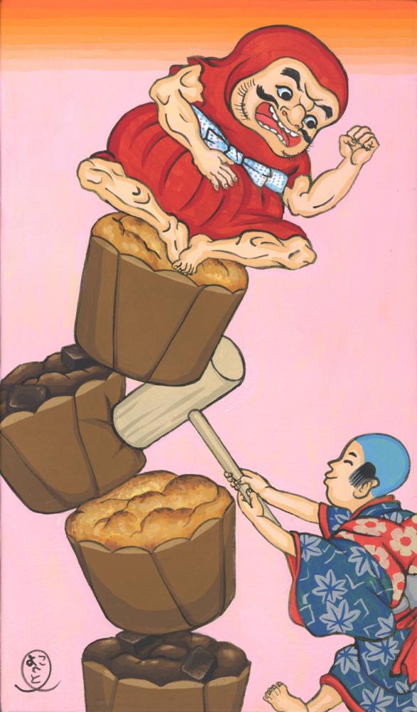 修行で空腹の達磨を子どもが悪ふざけで刺激している様子を マフィンの上にいる達磨落としに見立てています。 ※裏面に吊り下げ用の金具と紐が付いています。