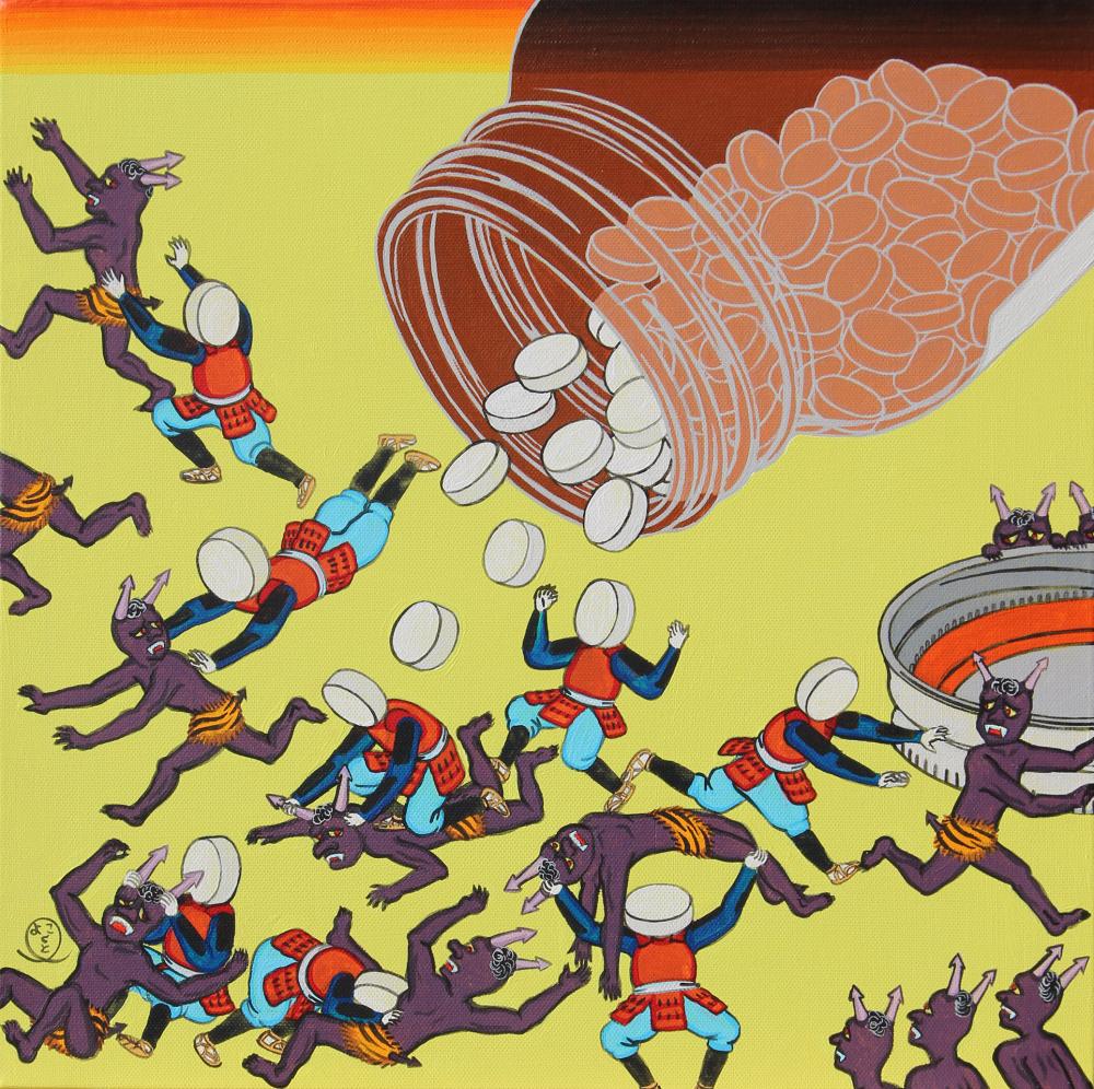 一粒の効果は大きくなくても、日々続けて飲むことで効果が出る薬を主役に、 この絵では薬瓶から飛び出した錠剤達を足軽隊に見立て、悪い菌を 懲らしめている姿として描いています。 ※裏面に吊り下げ用の金具と紐が付いています。