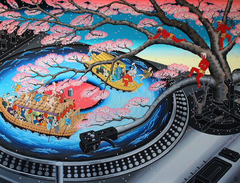 日々繰り返しのようで、俯瞰的に見れば再生中のレコードの針のようにちょっとづつ終わりに向かって移動していっていること、レコードをかけると過去に存在していた世界が甦ってくること、限られた再生時間に気づかず、美しい花や音楽の中で遊ぶ人々の儚さを描いています。 ※裏面に吊り下げ用の金具と紐が付いています。