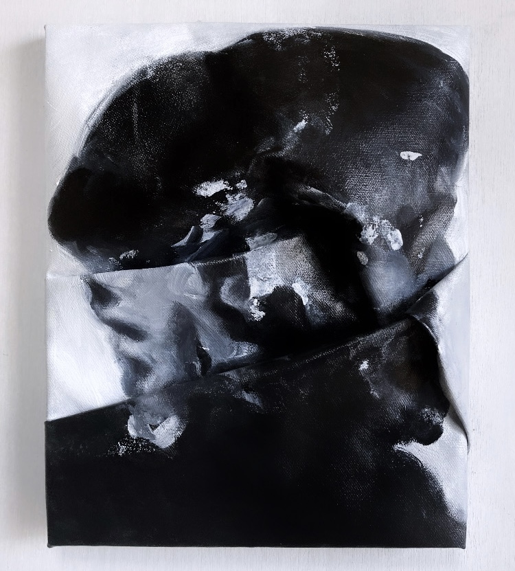 キャンバスや紙といった支持体を折ることで平面と立体、絵画と彫刻、内と外の境界をなくし、支持体が表現の土台という役割を越えて表面に可視化し直感的に作品表現へ参加する。