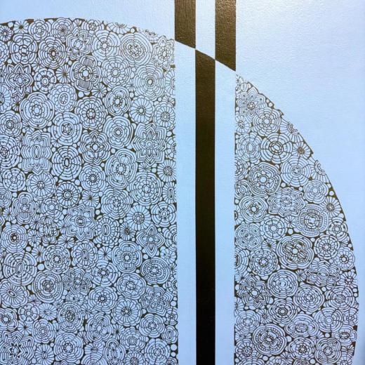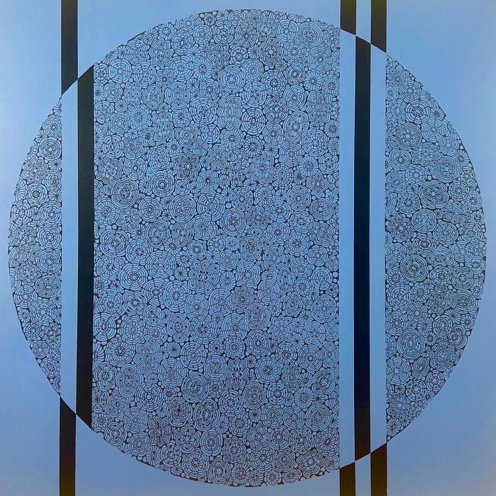 本作は、彼女の複雑なペン画世界を、模様、パターンや抽象的な塗りの筆使いと融合させた近作カラーシリーズから自薦の一作です。巧緻な仕掛けを含みながらもグラフィックな彩りと楽しさがあり、巨細に見て楽しめる新しい境地を示しています。