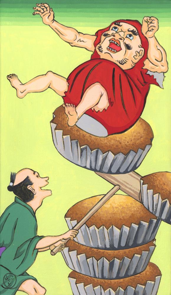修行で空腹の達磨を若者が悪ふざけで刺激している様子をマドレーヌの上にいる達磨落としに見立てた、河鍋暁斎の「暁斎漫画 達磨と蝉」のパロディ作品です。 ※裏面に吊り下げ用の金具と紐が付いています。