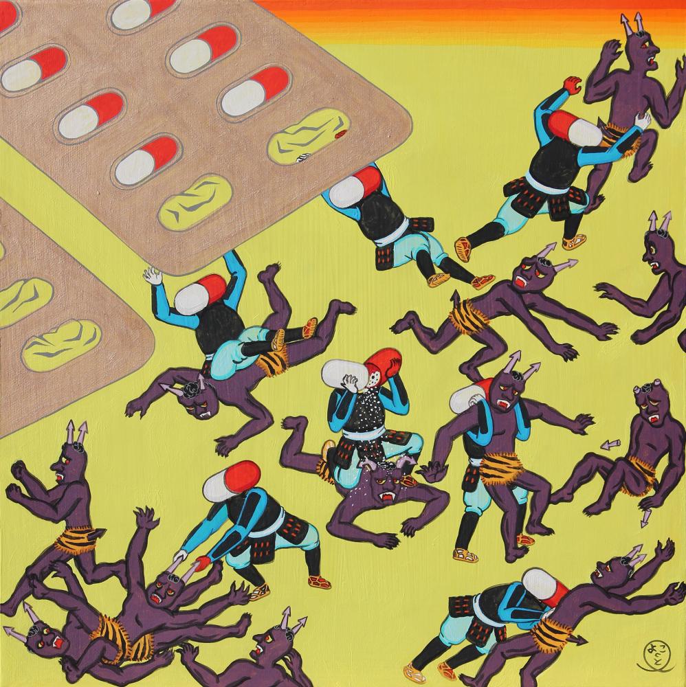 一粒の効果は大きくなくても、日々続けて飲むことで効果が出る薬を主役に、 この絵ではシートから飛び出したカプセル達を足軽隊に見立て、悪い菌を 懲らしめている姿として描いています。 ※裏面に吊り下げ用の金具と紐が付いています。