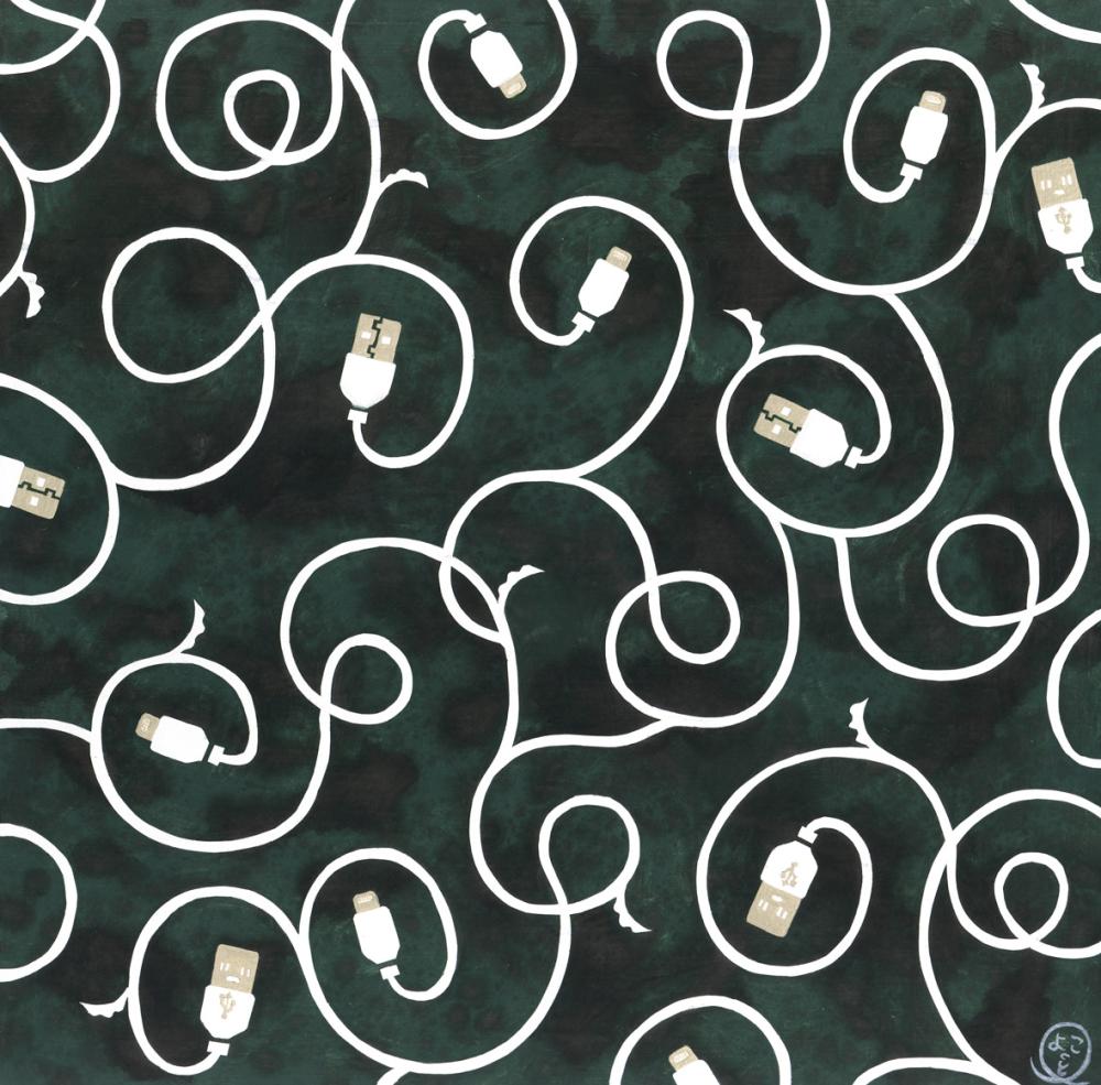 USBケーブルを唐草紋様に見立てて描いた作品です。 ※裏面に吊り下げ用の金具と紐が付いています。