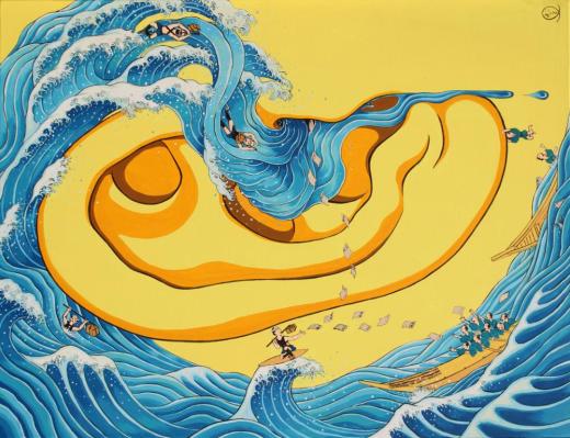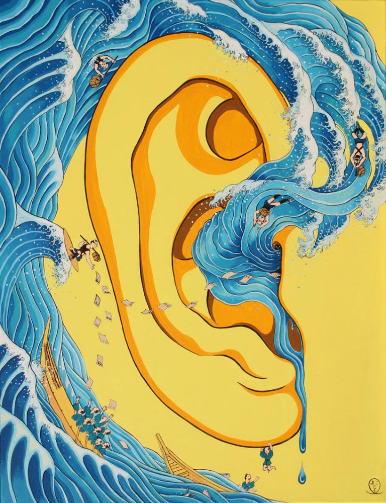 「顔の穴」は、生きている人からは水が表出することに着目した連作です。 この絵はあらゆる感情を生み出すきっかけの、突然の知らせが耳へと怒涛のように流れ込んでくる瞬間を描いた、葛飾北斎の浮世絵「神奈川沖浪裏」のオマージュ作品です。 縦長・横長(寝た時の耳の向き)、どちらの構図としても鑑賞していただけます。 ※裏面に縦長の向きで展示できる吊り下げ用の金具と紐が付いています。
