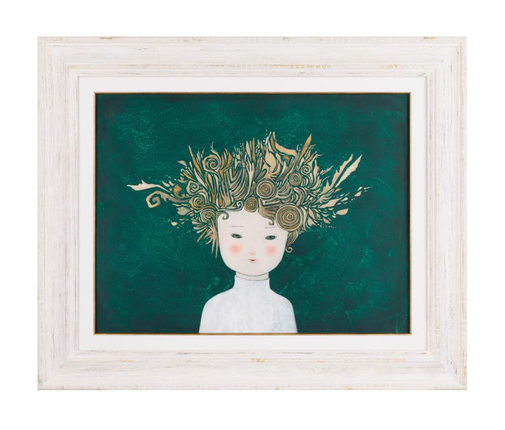 越後しの氏が一貫して追い続けているのは、その時々の自分の心象風景だといいます。念写のようにして日々、彼女の手元から生まれるユニークな「自画像」には、原画か版画かを問わず、詩的な含意の膨らみと民芸品的な可愛らしさがあります。 本作は、近作から自薦の1枚です。深い森の中で草木が奏でるメロディをイメージしています。