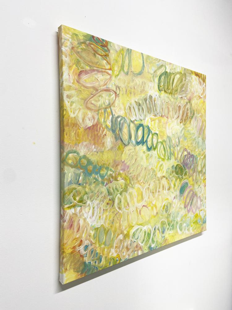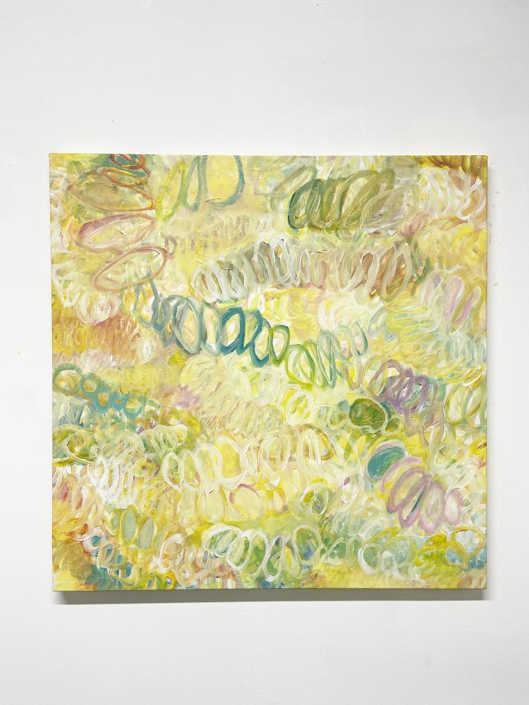 アクリル絵具や油絵具による塗りのつぶれやかすれ、色の重なり合いや模様のようなものたちが作り出すユニークなハーモニーが、彼女の絵の最大の美質です。その時々の彼女自身が置かれた環境や内面世界が手から筆へと転送され、色合いはときにオーソドックスな油画の伝統を思わせるメランコリックな情緒をまとい、時にはストリートアートのようにポップで鮮やかな躍動で見るものの心を震わせます。