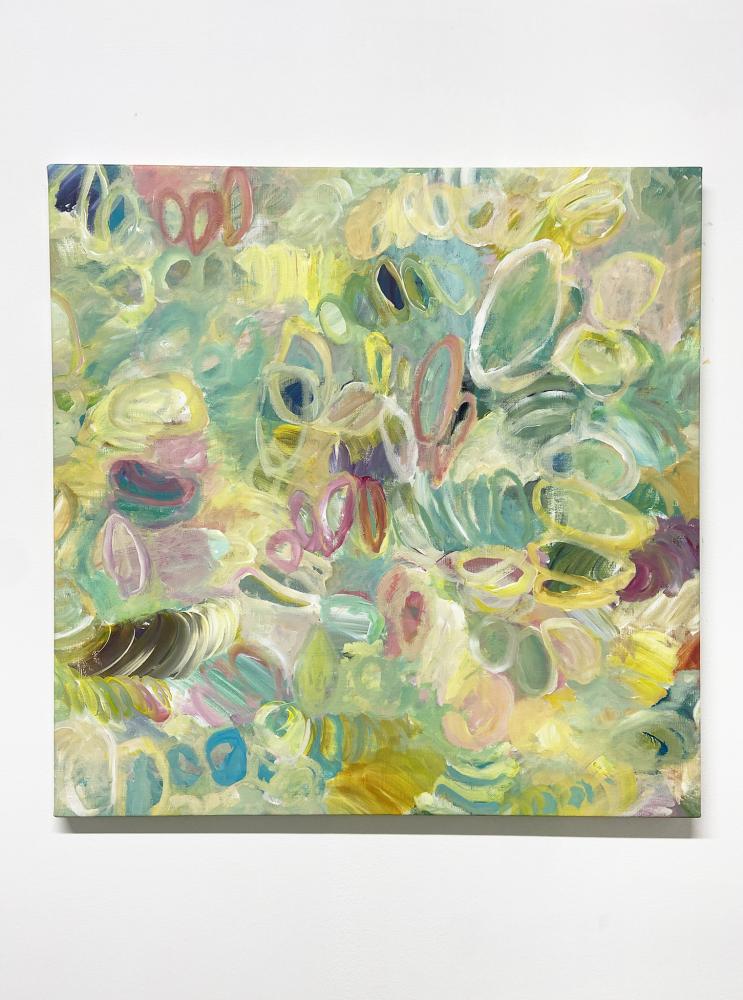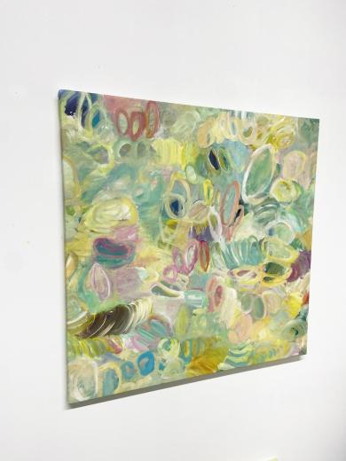 アクリル絵具や油絵具による塗りのつぶれやかすれ、色の重なり合いや模様のようなものたちが作り出すユニークなハーモニーが、彼女の絵の最大の美質です。その時々の彼女自身が置かれた環境や内面世界が手から筆へと転送され、色合いはときにオーソドックスな油画の伝統を思わせるメランコリックな情緒をまとい、時にはストリートアートのようにポップで鮮やかな躍動で見るものの心を震わせます。
