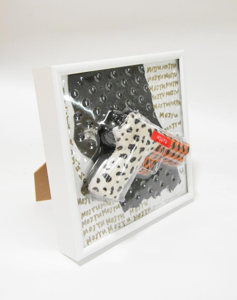 私は人間が持つ普段は内に秘めている本能やふとした時に理性では抑えきれない感情的な部分,抗うことができない自然の摂理を「獣」と呼び、作品化しています。銃と獣という読み方が同じものを掛け合わせて制作した作品です。