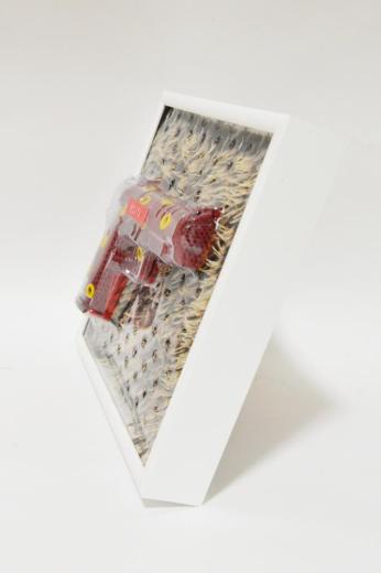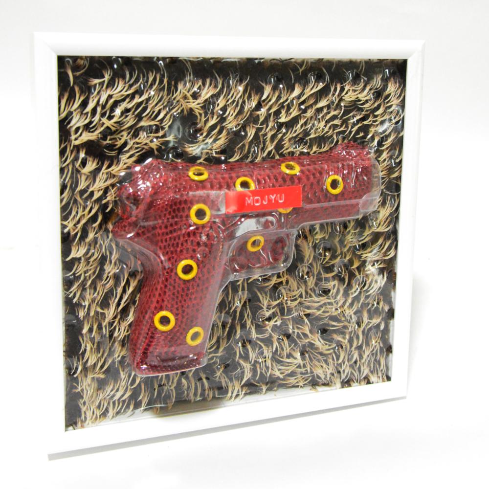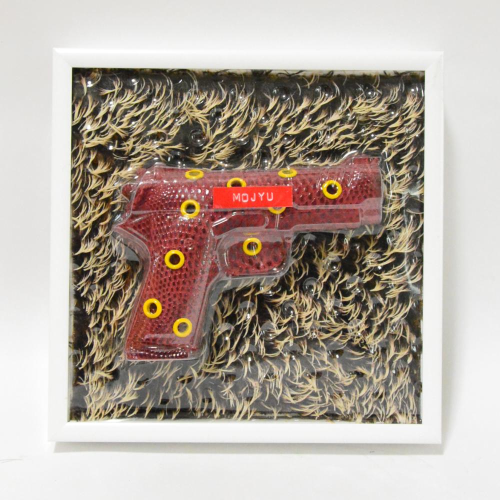 私は人間が持つ普段は内に秘めている本能やふとした時に理性では抑えきれない感情的な部分,抗うことができない自然の摂理を「獣」と呼び、作品化しています。銃と獣という読み方が同じものを掛け合わせて制作した作品です。