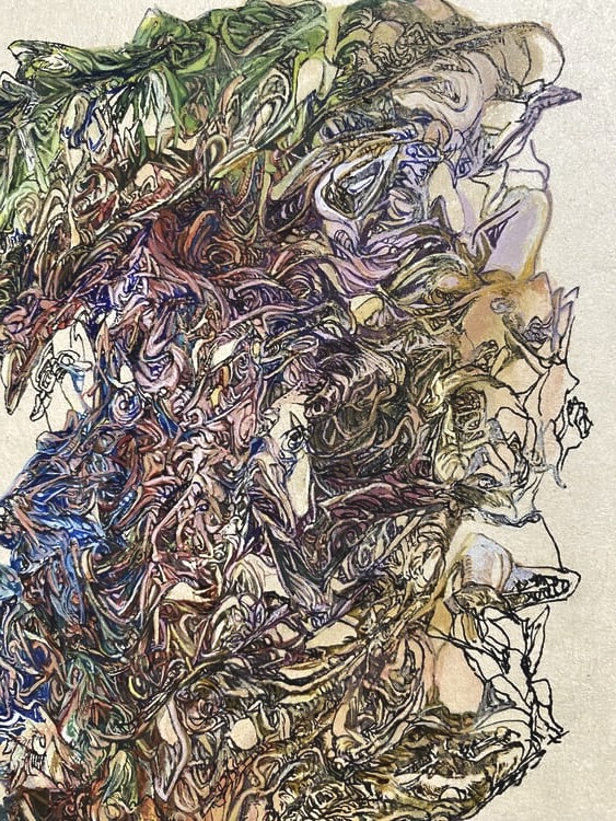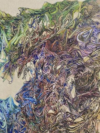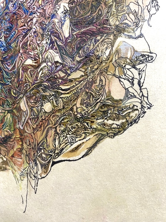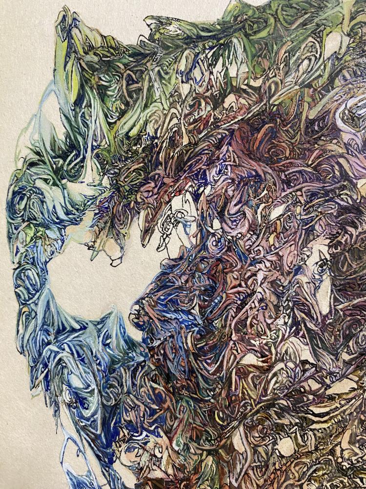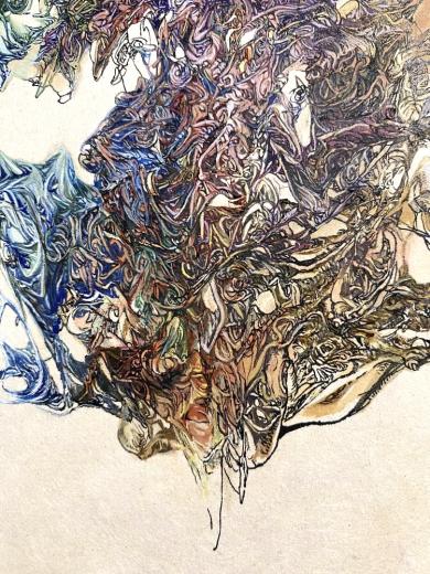 Each one of her lines, which are precise but sometimes boldly drawn, overlap numerous times and intersect, creating a wide range of tones and pulling us in to the deep world of the artwork.