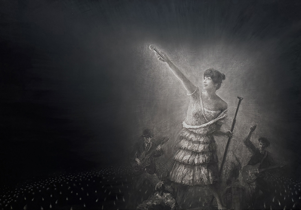In this work, Tomonari draws on the composition and symbolism of Liberty Leading the People by Eug?ne Delacroix, translating the revolutionary fervor and collective energy of the crowd into the image of an idol standing on a modern stage.