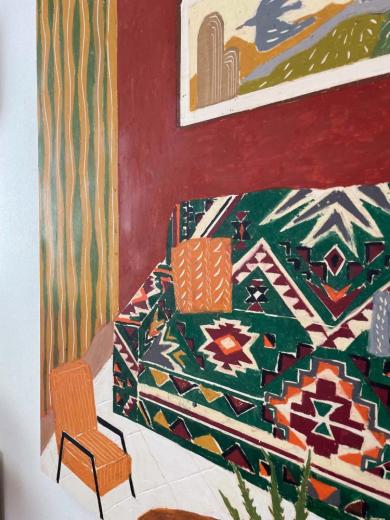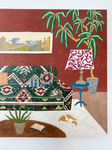 赤茶の壁と緑の柄ソファのある部屋