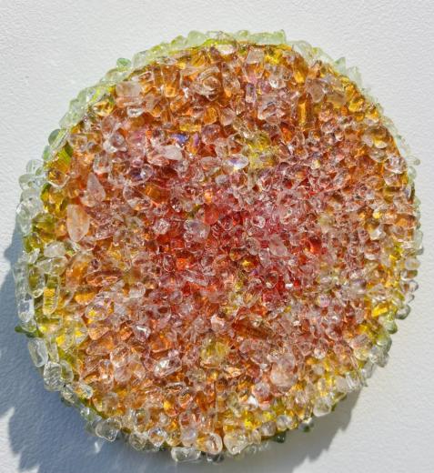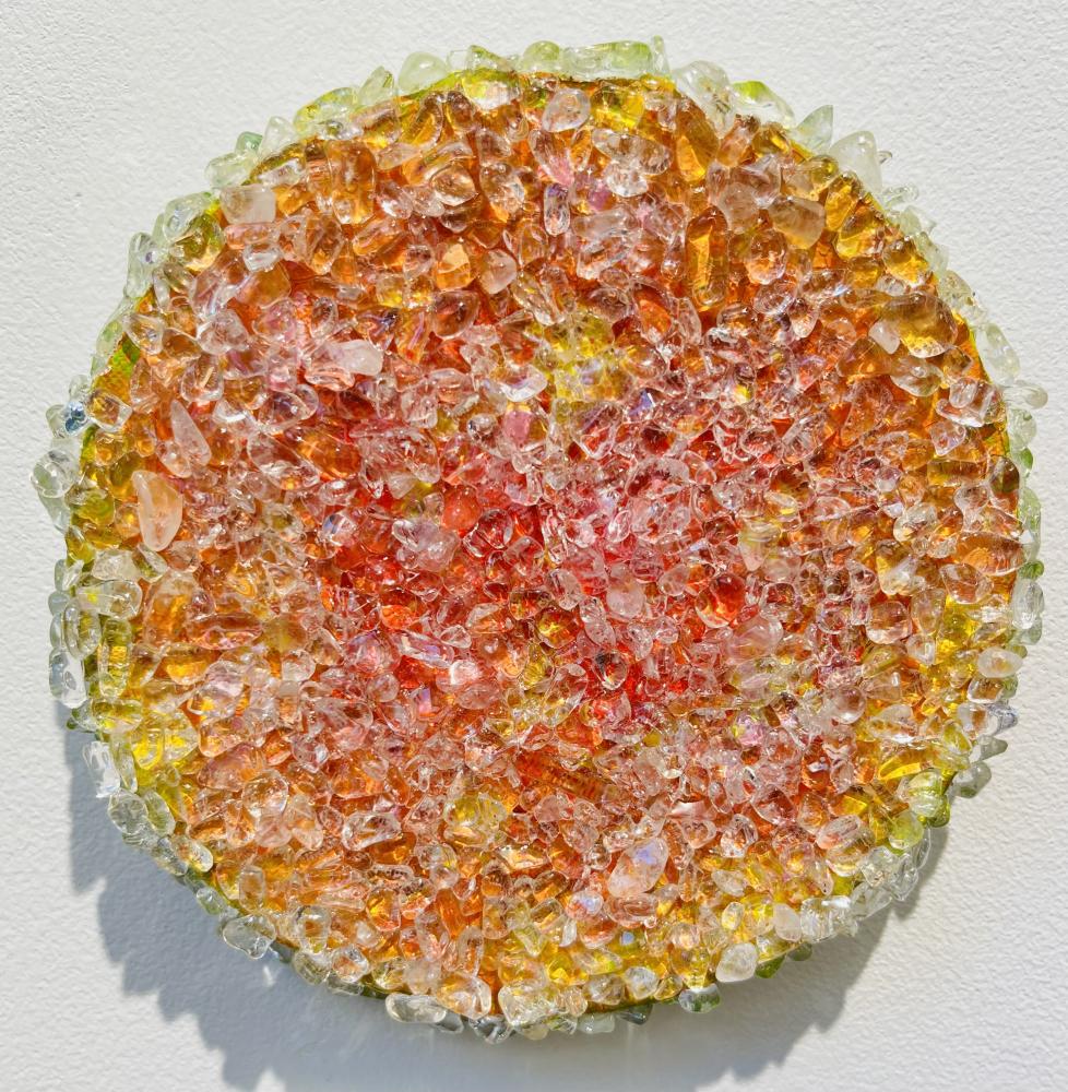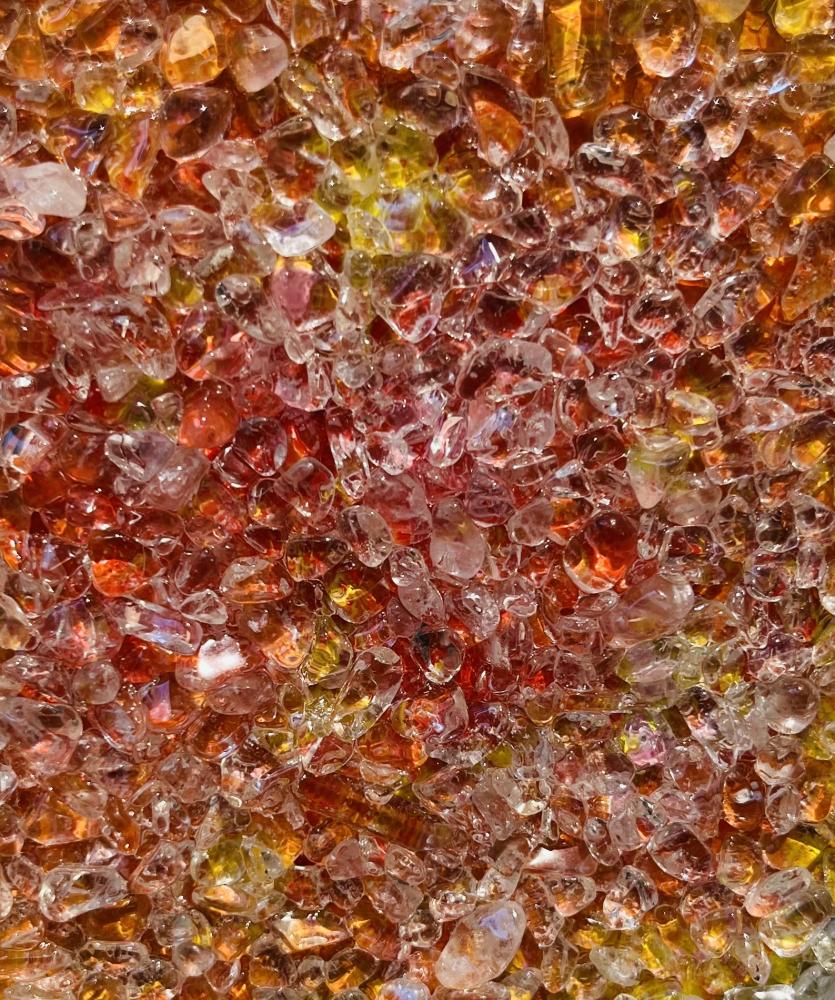 水晶は、気の浄化やカームダウンに役立つなど代表的なパワーストーンとされています。カウンセラーやデザイナーとして様々な素材・物質を研究する過程で彼は、この作用を絵画に活かす手法を開発してきました。通常、水晶を粉末化したものは日本画において透き通った白の表現に用いられますが、サト氏の絵では天然の水晶が細石(さざれ)状で使われ、絵の放つエネルギーをブーストし、より強く豊かにするのです。世界でも類例のない独特な絵画手法への評価は定着してきており、絵によって癒やされる、などという体験をナラティブに伝え合おうとする熱心なコレクター層が形成されています。