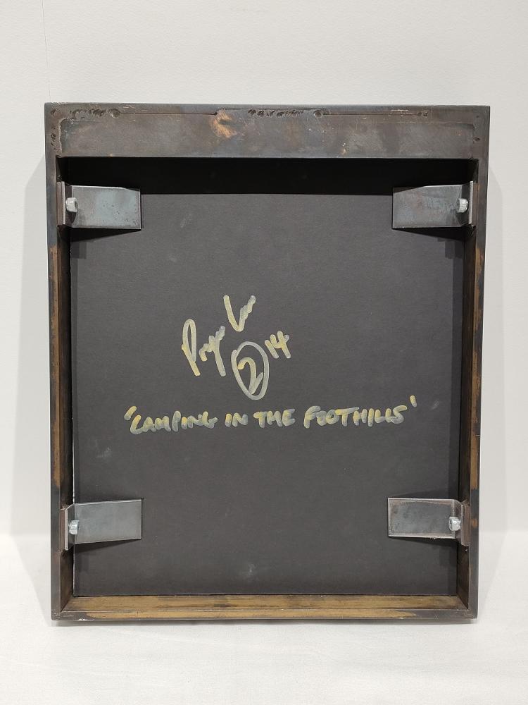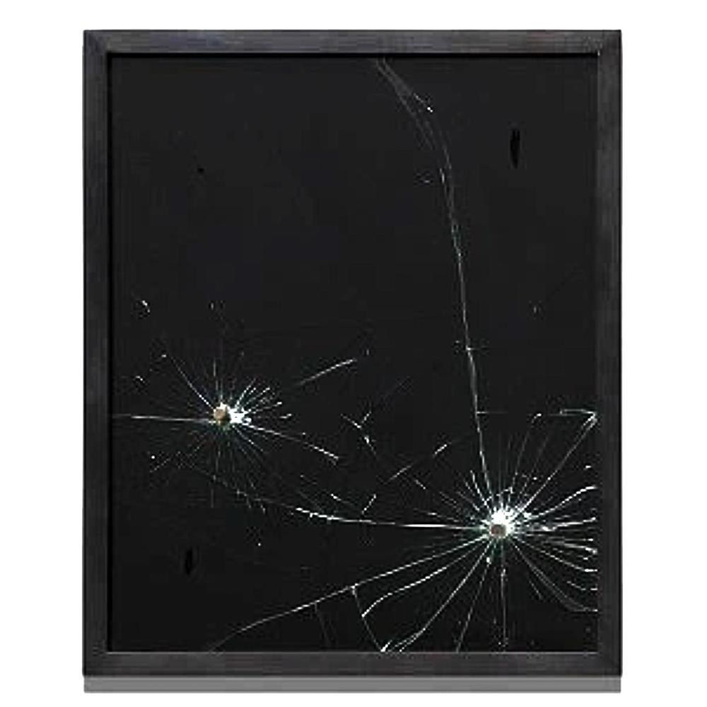 Laminated glass, black acrylic, steel frame and cast bullet