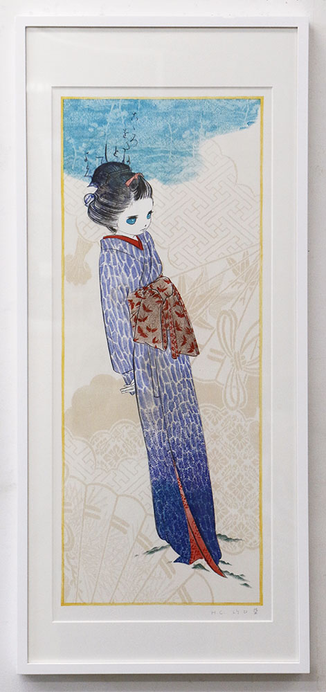 今の瞬間を生きる少女たちと長い時代生き続ける木々、今描かれた絵と古い着物地、それらがリトグラフの中で一つとなり、古今が同時に流れゆくかのようです。