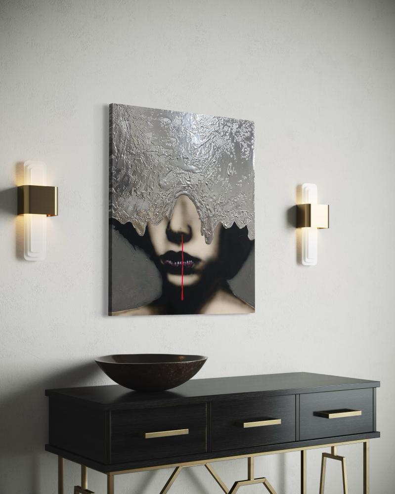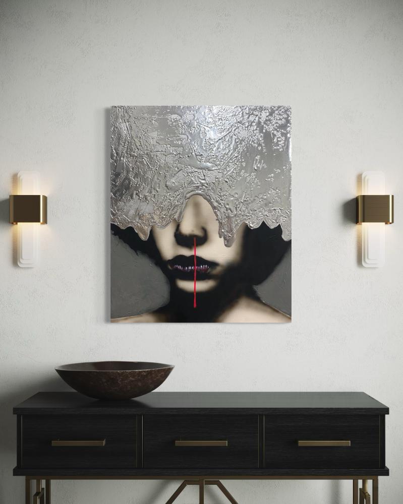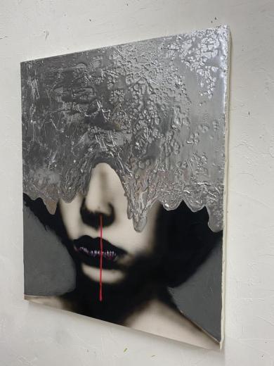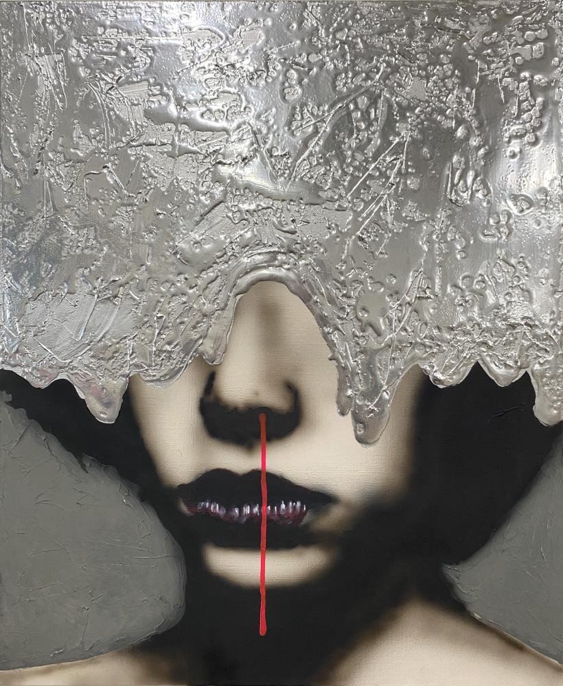 本作は、近作のアクリル画から自薦の1作です。ポートレートの概念を再構築するかのような野心に満ちています。