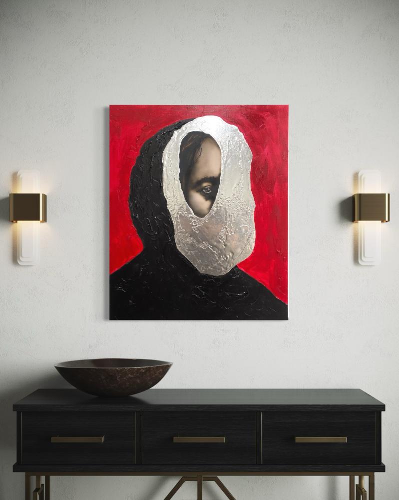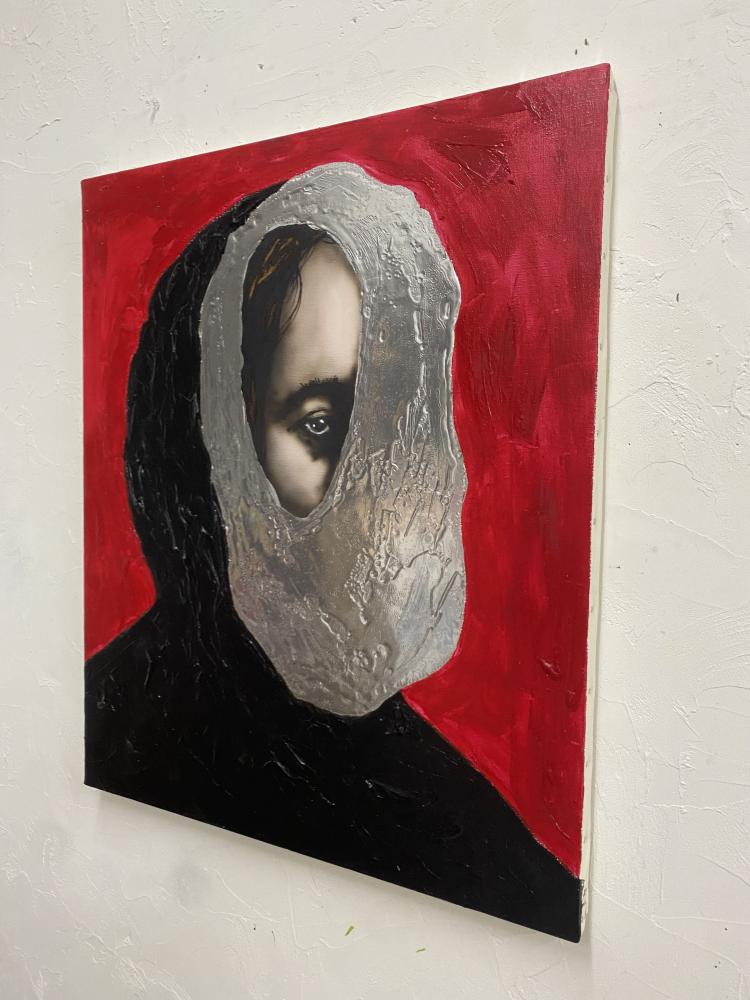 本作は、近作のアクリル画から自薦の1作です。ポートレートの概念を再構築するかのような野心に満ちています。