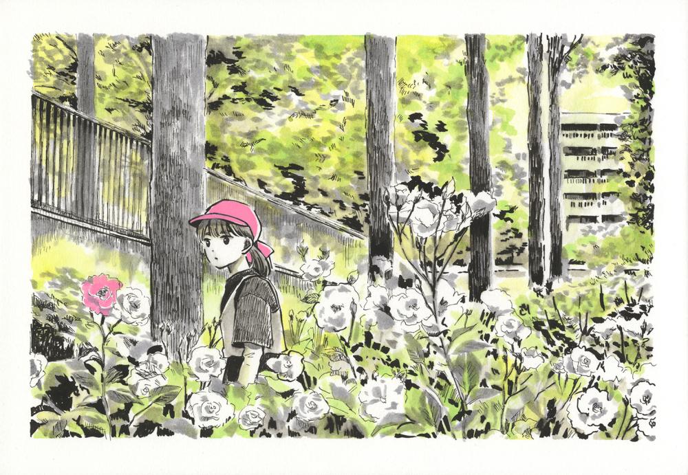 本作は、繊細な風景描写で知られる鉛筆画シリーズから発展し、線描にインクを用いた近作です。日常の記憶の風景を舞台に展開される空想の物語。咲き乱れる数々の花の中で「自分に似た花」を見つける、という小さな気付きの瞬間が描かれています。2人展「みらいをほどくおまじない」(2025年、吉祥寺・GALLERY IRO)にて展示され好評を博しました。