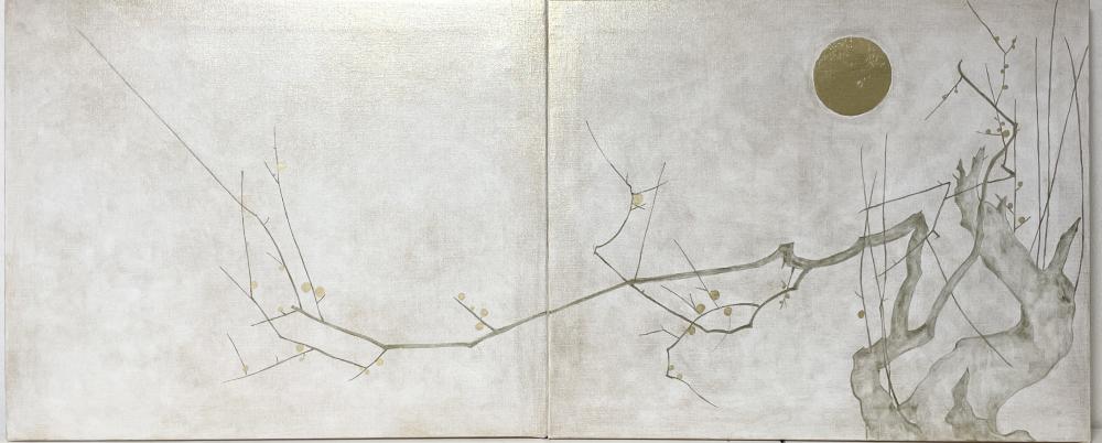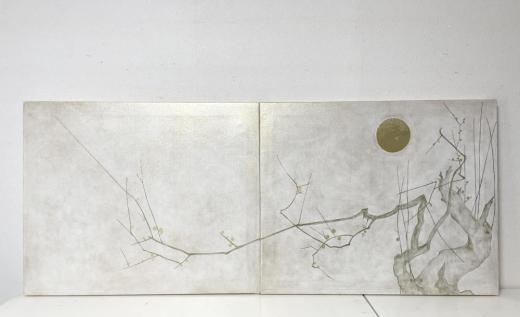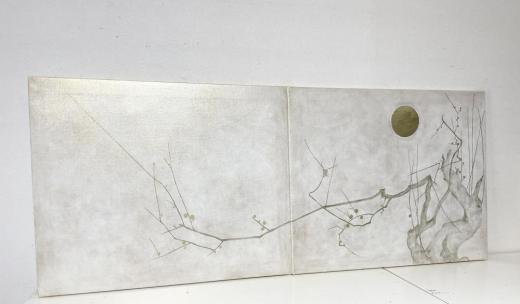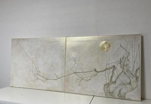 キャンバスに油彩と箔で白梅図と月の絵を描きました。 2枚で一枚になります。