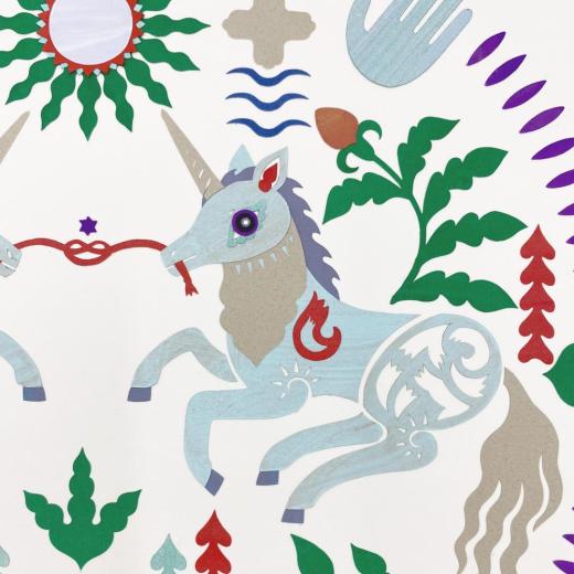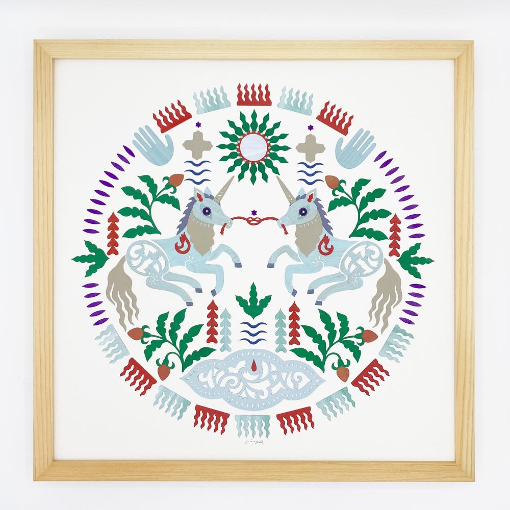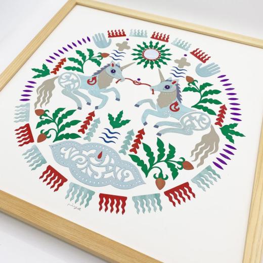 本作は、平面の切り絵作品から自薦の一作。「つがいのユニコーン」を描いたもの。展示には未出展の作品です。