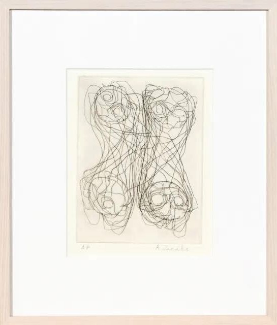 1950年代に開催された「舞台における具体美術」展で、明滅するカラフルな電球と管球の光を服に見立てた「電気服」を着るパフォーマンスを行った事で広く知られるようになり、抽象画家としての一歩を踏み出します。1955年に金山、白髪、村上と共に、吉原治良がリーダーを務める具体美術協会に加入し、同協会の主要メンバーになります。2001年には芦屋市立美術博物館と静岡県立美術館でそれぞれ大規模な個展を開き、絵画とオブジェによって表現された独特の精神世界は国際的にも大変高い評価を得ると同時に、草間弥生、オノヨーコに並ぶ偉才と評される等、その地位を確固たるものにしました。