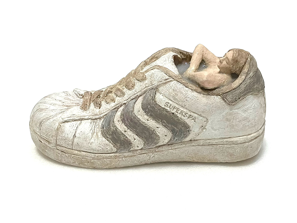 Believing that rest and healing are essential along life’s journey, I placed a “hot spring” inside the shoes as a symbol of comfort and relief.