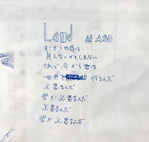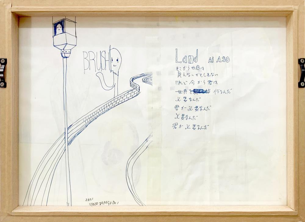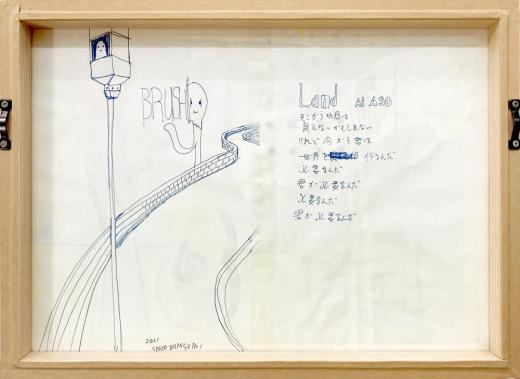 裏にボールペンドロイング、歌詞。全体に折れやシワが見られるが、制作当初のオリジナルのものと推定される。Ballpoint pen drawing and lyrics on the back. Although there are folds and wrinkles throughout, it is believed to be the original from the beginning of production.