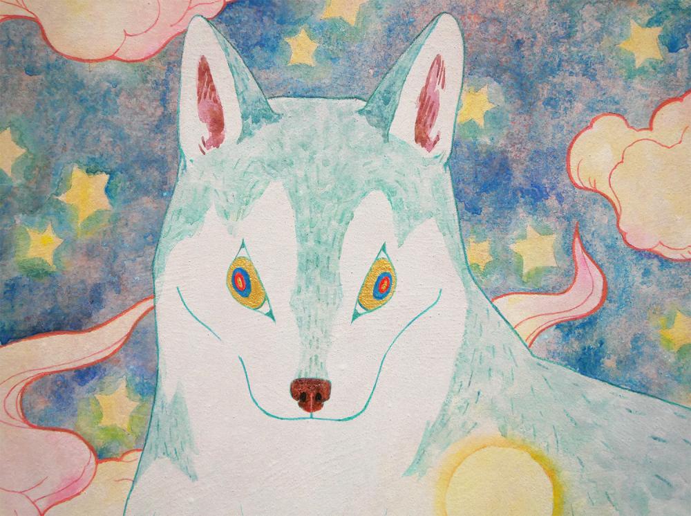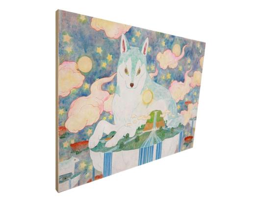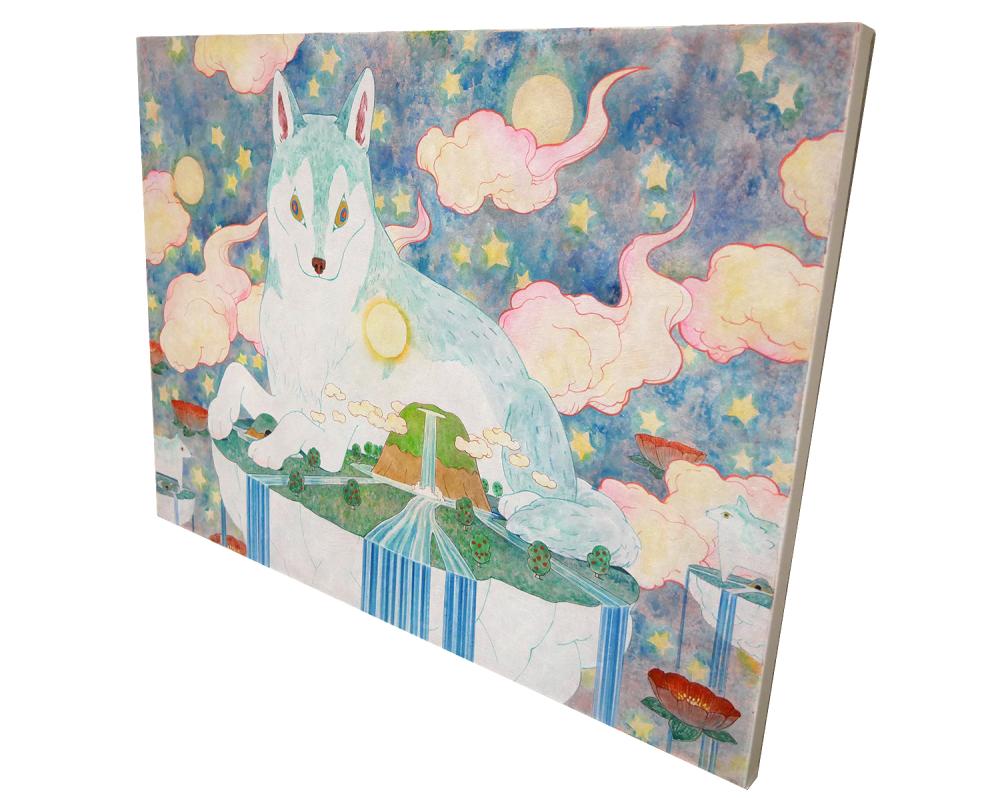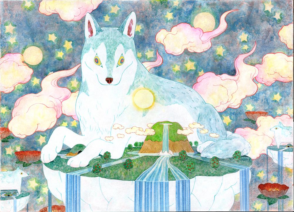 「神の遣いであるこのオオカミは私達の住む夜の世界を守ってくれています。この島は私達の住んでいる世界で、書き割りの様に描き人間が作ってきた世界を表しています。」(保坂氏のステイトメントより)