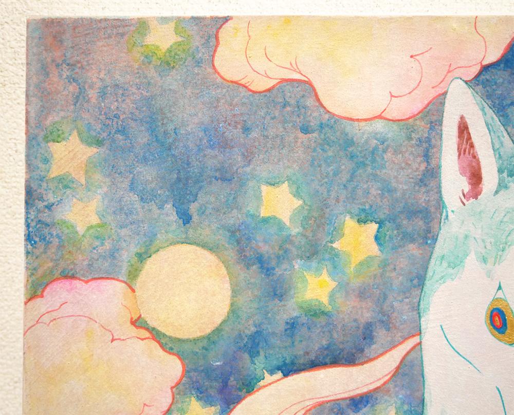 本作は保坂氏の近作から自薦の一枚です。ざらりとした壁画のような表層の細やかな仕掛けが、光のニュアンスをさらに魅力的に引き立てます。もう1枚の「世界守護犬(昼)」の世界と対になる「夜」の世界。2作を見比べる楽しさもあります。