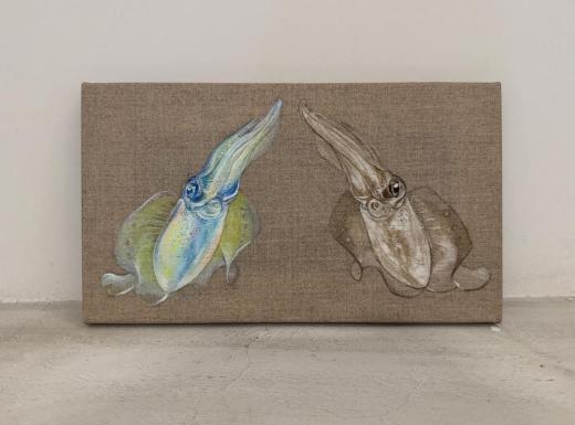 レンブラントやダヴィンチも使用していたイカ墨から作られたセピアインク、学術的にも貝殻とされるイカ甲を胡粉に加工し自作した絵の具でイカを描いている。