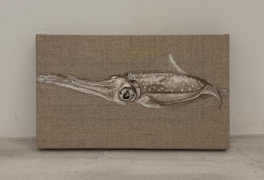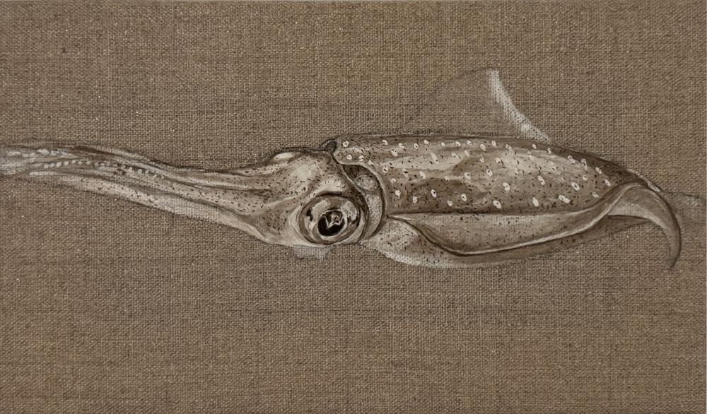レンブラントやダヴィンチも使用していたイカ墨から作られたセピアインク、学術的にも貝殻とされるイカ甲を胡粉に加工し自作した絵の具でイカを描いている。