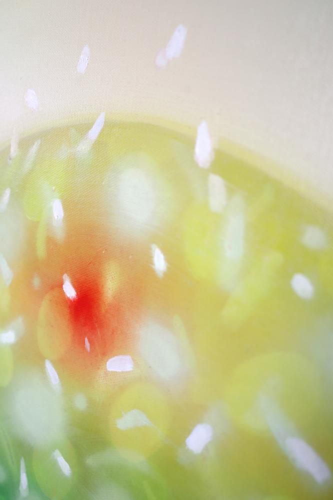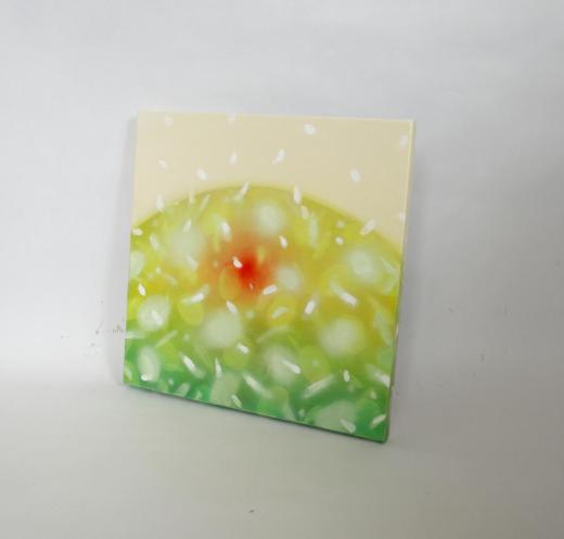 中心の赤い光が中核となる種で、そのまわりにいる白い線がその赤い光の種を大きくするものとして描きました。人も思いがけない話の種から様々な人の繋がりで大きくなる様子を絵で描きたいと思い制作した作品です。