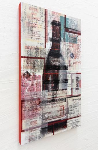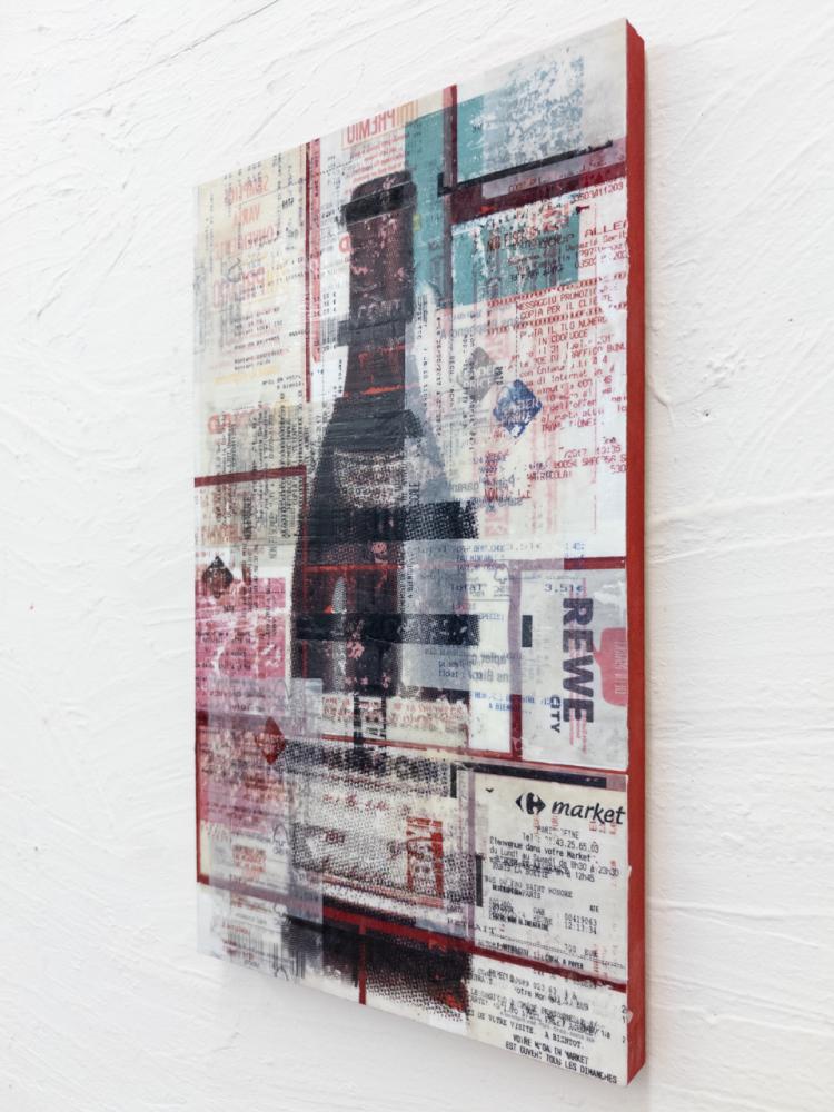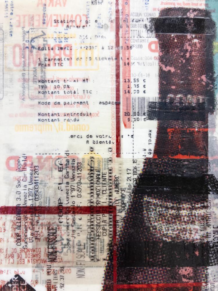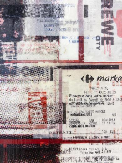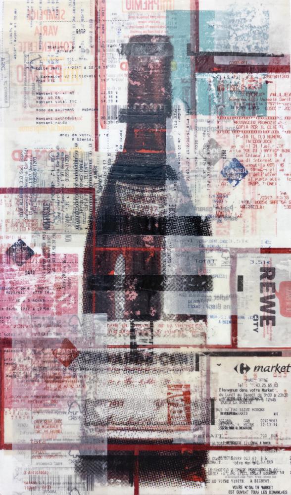 アクリル絵の具やトナーインク転写を多層的に重ね、さらに2017年にヨーロッパで集めたレシートをコラージュすることで、消費社会を批判する視点を浮き彫りにした作品。ワインが熟成するようにアートの価値も積み重なり方によっては崩れやすいことを暗示し、現在フランスで発行が禁じられているレシートを用いることで、欲望の連鎖が生む破綻の危うさを浮き彫りにする。ひとりの些細な消費が社会全体を揺るがす可能性を示唆し、消費社会の未来へ警鐘を鳴らしている。