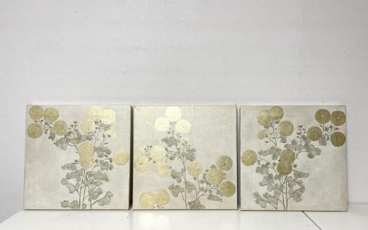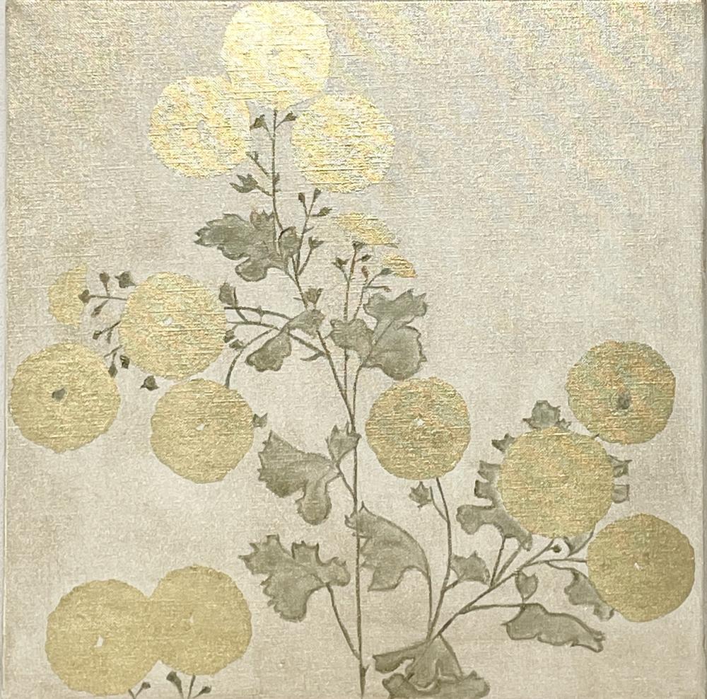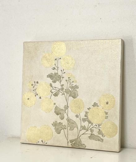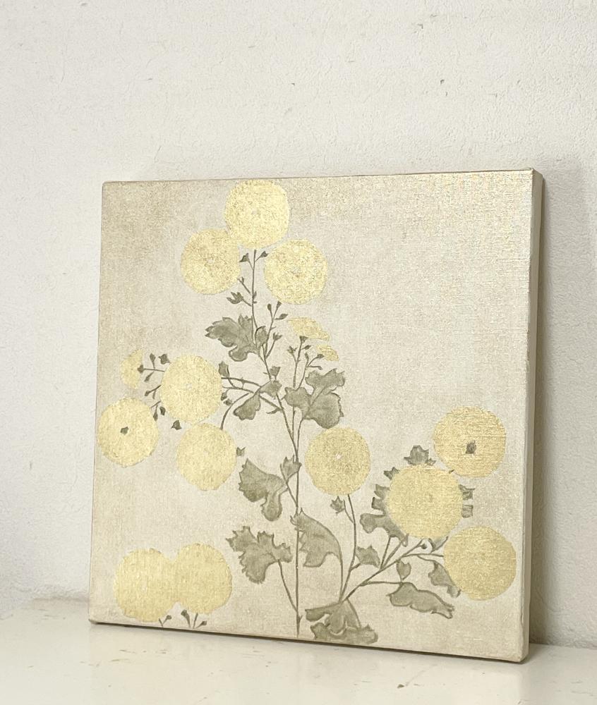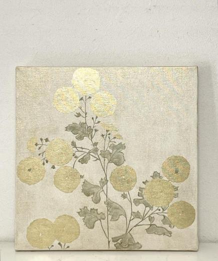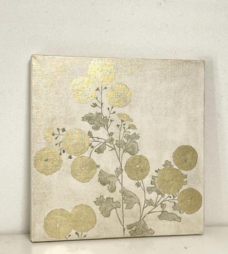 キャンバスに箔と油彩で菊の絵を描きました。