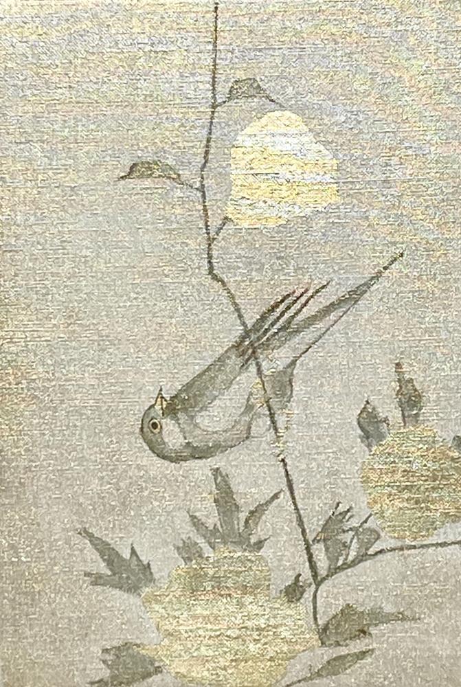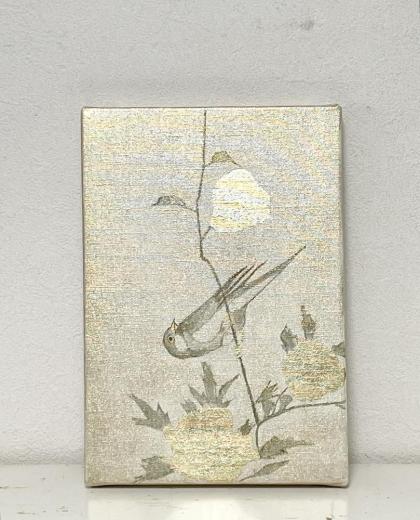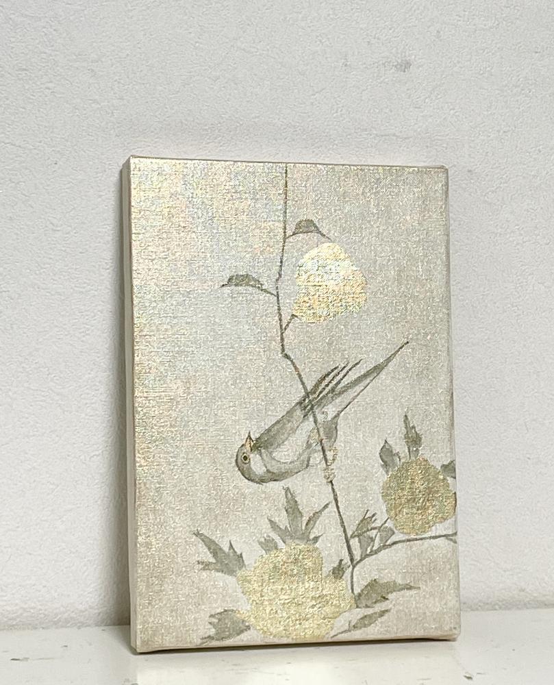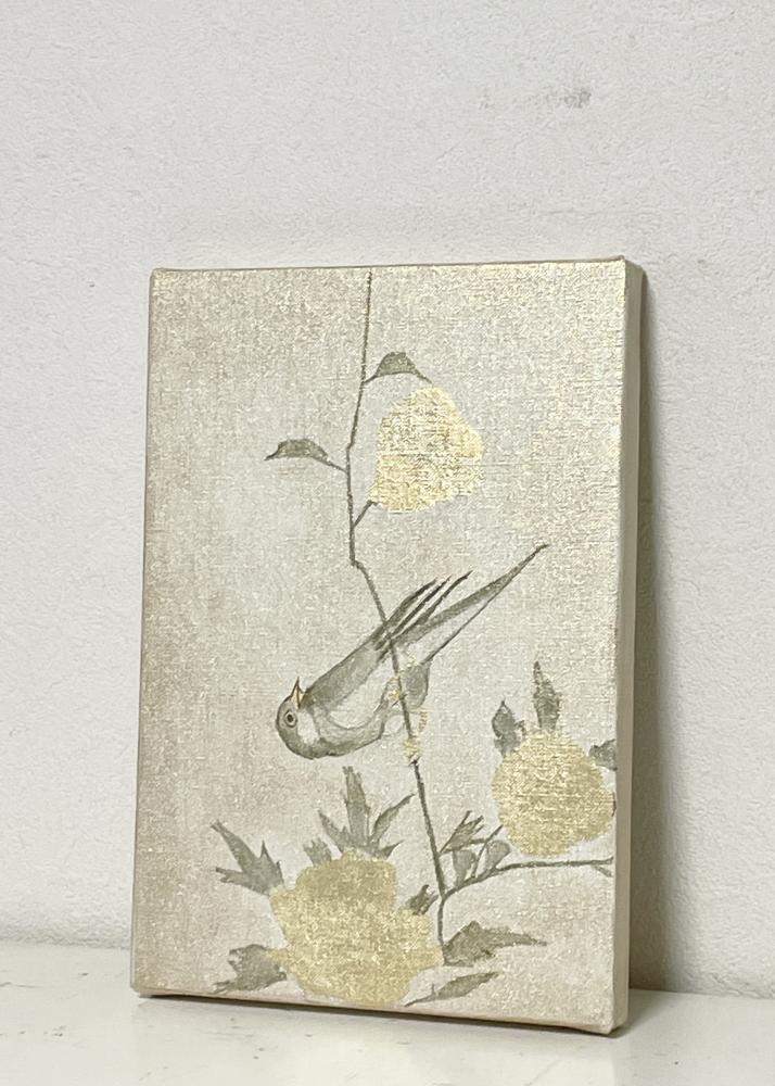 キャンバスに箔と油彩で花鳥の絵を描きました。