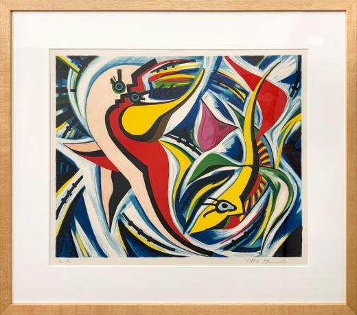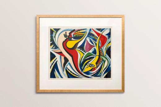 The artwork will be delivered in its existing frame, and the framing fee will be the cost of the yellow bag and the box.