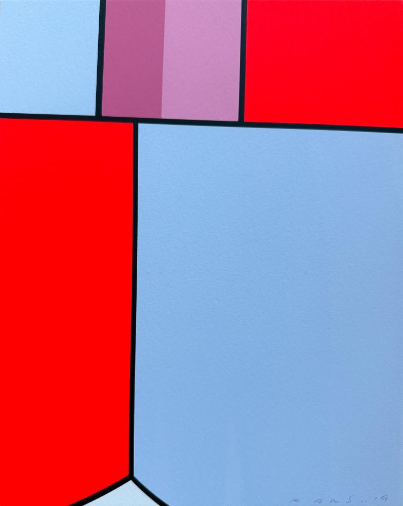 ポップカルチャーの断片を抽象化して再構成する近年の絵画的関心が、コンパクトな画面で明快に示され、色面の重なりとカットアウトのような形態がKAWSのアイコニックな語彙を想起させます。本作はエディションではなく一点物(unique)として制作された同系列作の一作であり、展覧会のコンテクストを伝えるドキュメント性も併せ持ちます。