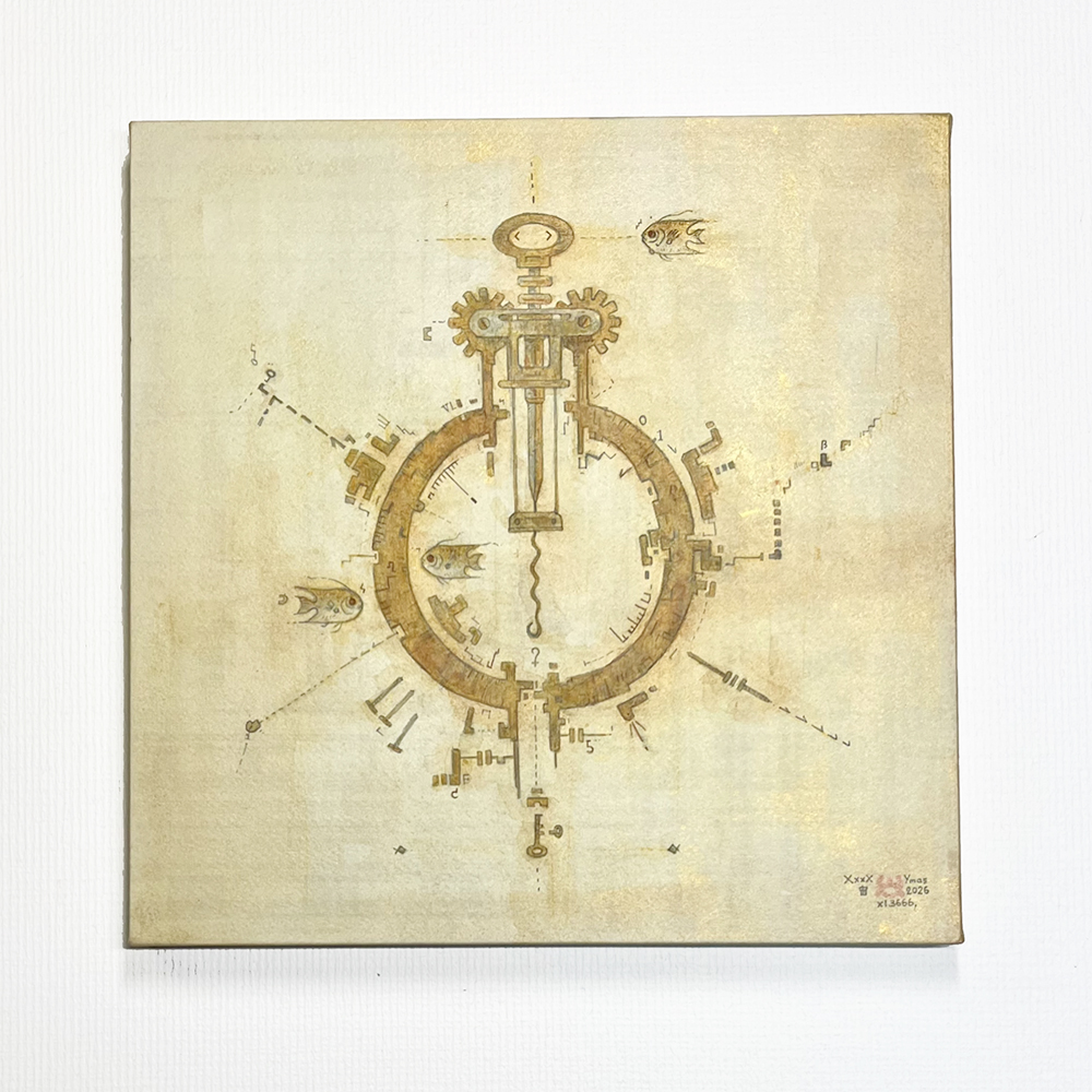 デジタル画像、アクリル、金泥、顔彩、水彩、色鉛筆、顔料インクの繰り返し、塗り重ねによる異なる質感のテクスチャの重なり合う効果(交差)を狙いました。