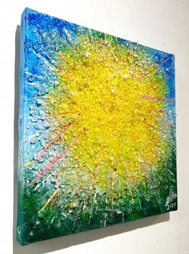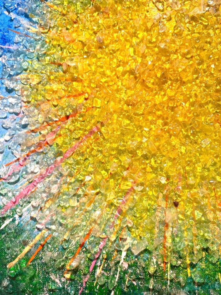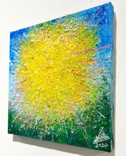 自然界の生命力を転送してくれるような、サトチヒロ氏の絵画世界。それを極めて独特なものにしているのは、絵具に加え「水晶」を画材として用いることで生まれるダイナミックな絵肌とその輝きです。