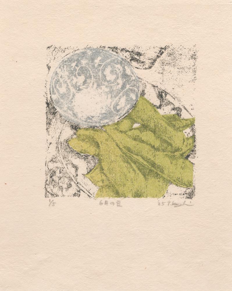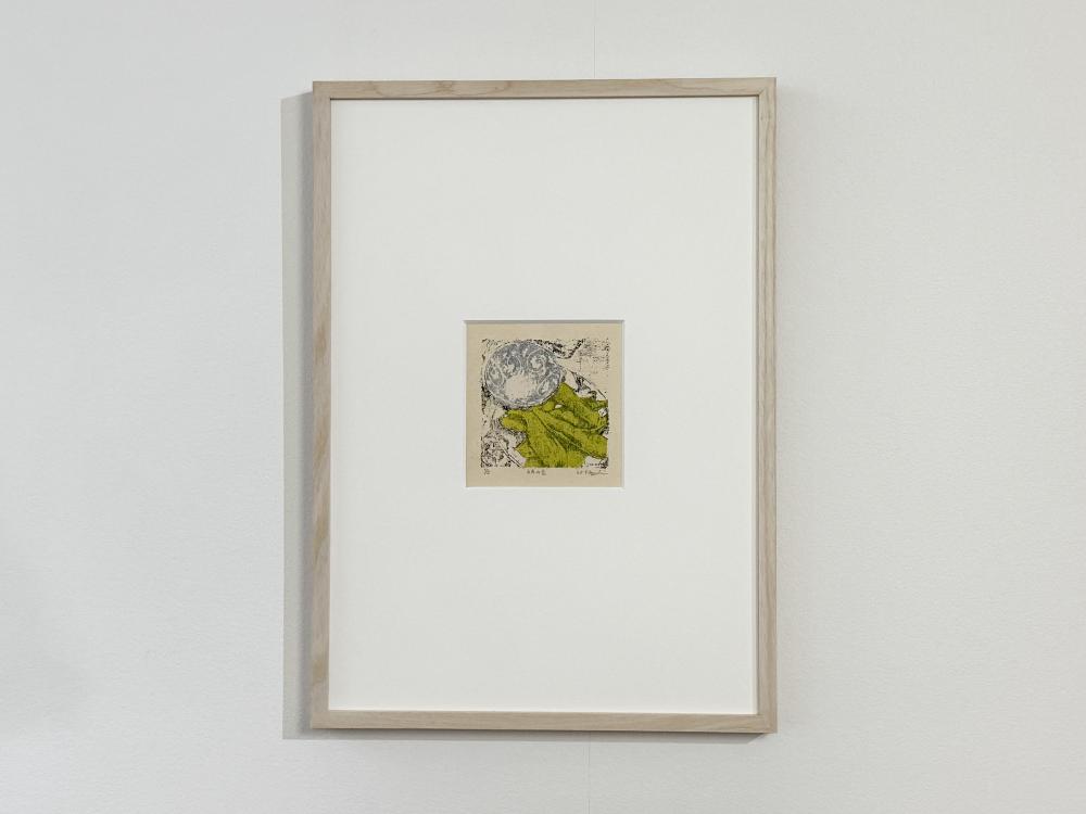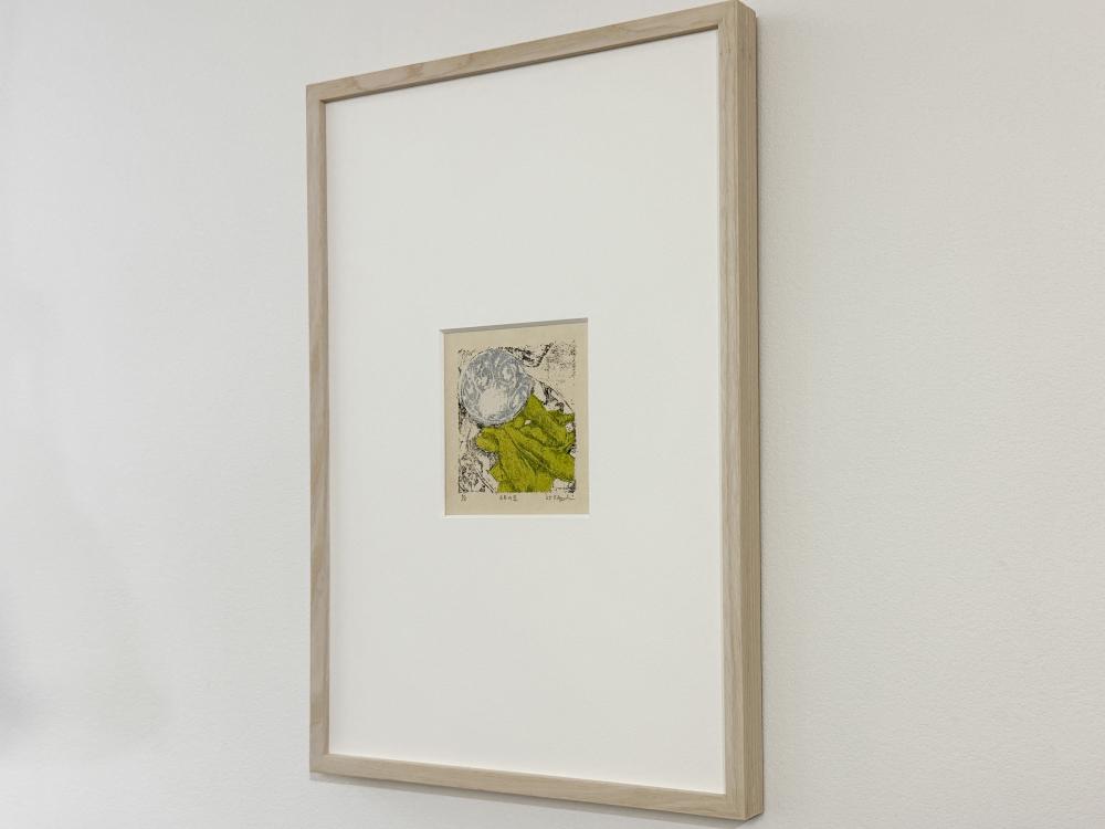 本作は、器シリーズから派生したシリーズの一作。彼女が出会った器と色を写し取った、謄写版アートならではの繊細な味わいが魅力的です。