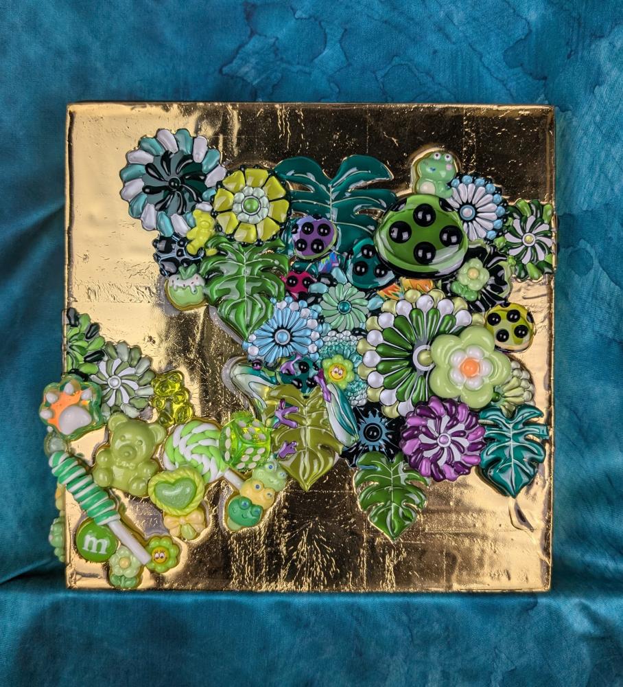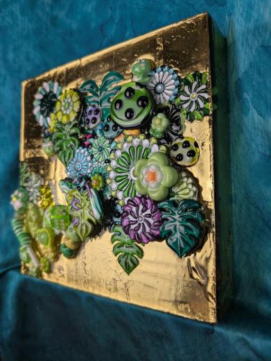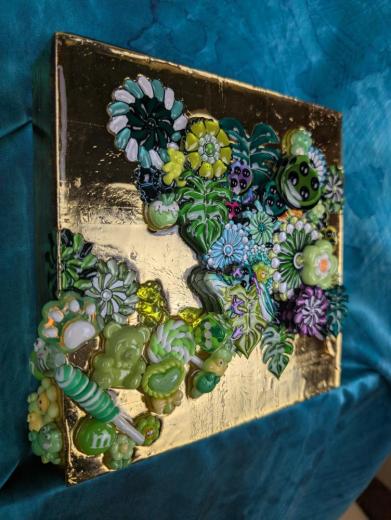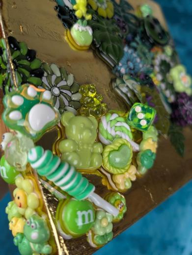 月乃カエルの作品は、透明樹脂を中心として、様々な素材で構成されたミクストメディア作品です。