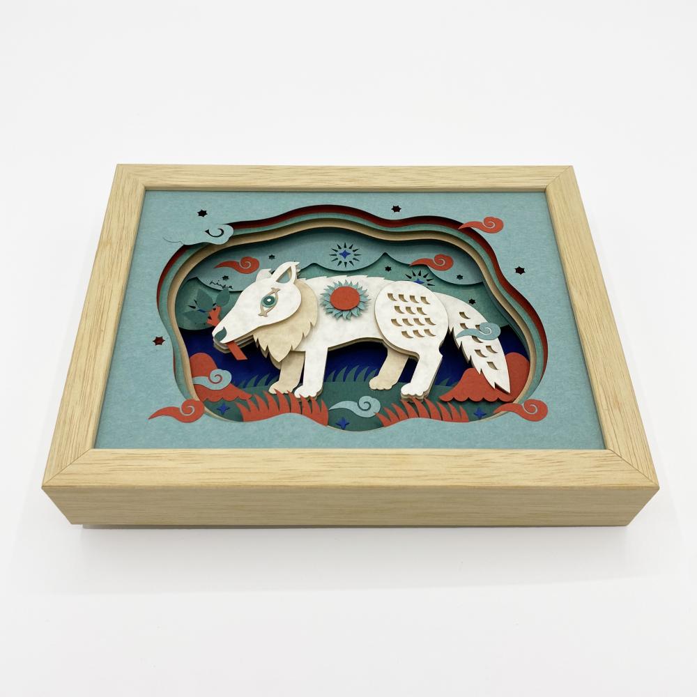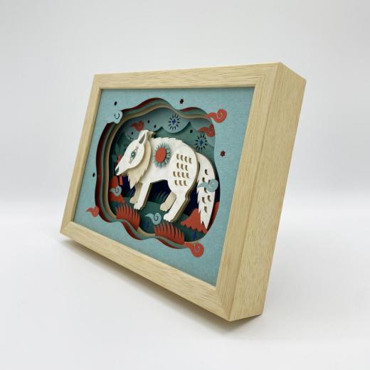 本作は、紙をレイヤーにした立体切り絵シリーズの一作。「山より大きな白い狼」を描いたもの。展示には未出展の作品です。