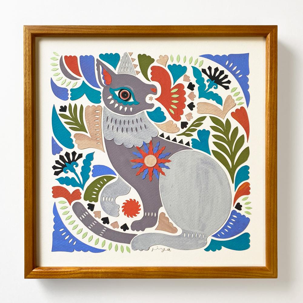 おもにカッターと紙によるアナログな技と豊かな多重的構成によって表現される、動物や鳥、小さな生き物たちの物語。riya氏の切り絵作品では、限定的に見えるアイコニックな表現にもかかわらず、カッティングの線がいきいきと雄弁で驚くほど深いニュアンスが感じられ、額の内部空間にまるで宇宙の真理が秘め隠されているかのようです。