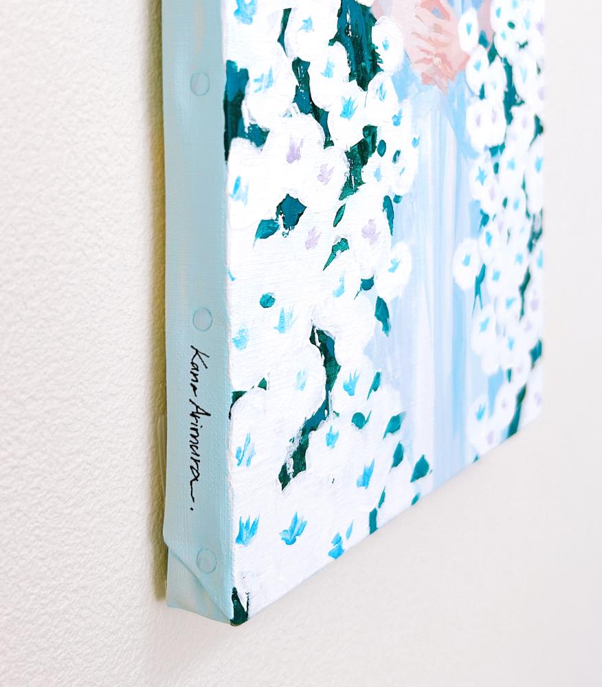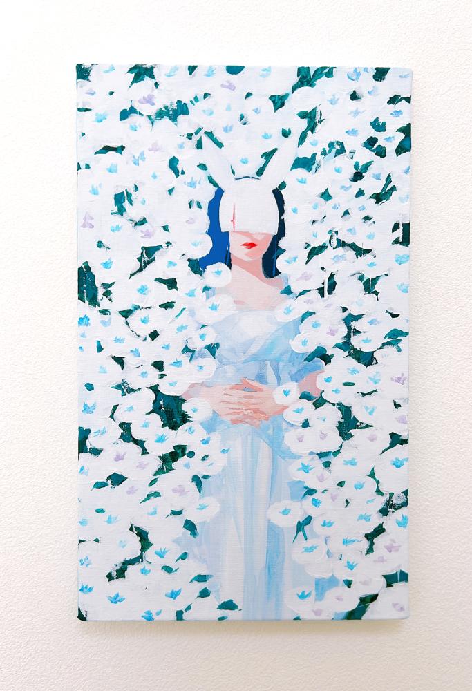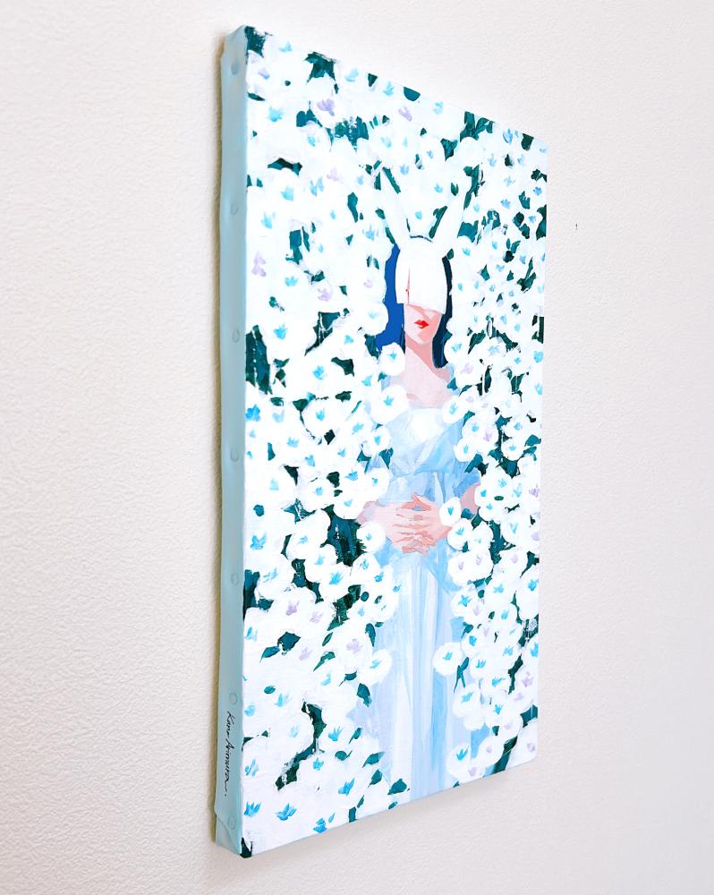 In this body of work, I depicted young women standing in Shibuya, with their surroundings gradually transforming into fields of flowers—not through video, but through a sequence of paintings (two size M60 pieces and six size M6 pieces). Each canvas captures the passage of time in still images, much like the key frames of an animation.
