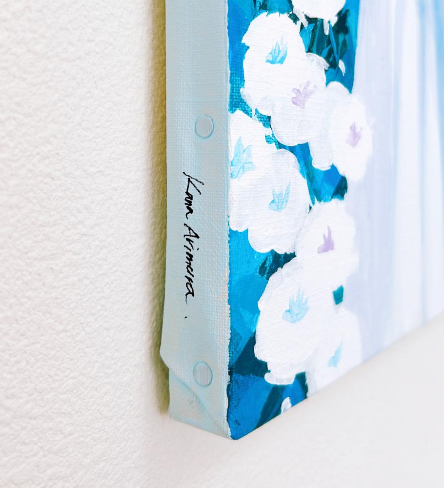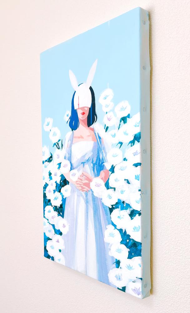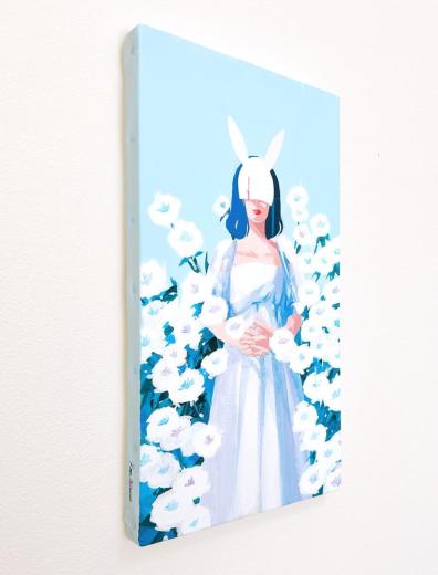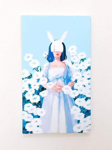In this body of work, I depicted young women standing in Shibuya, with their surroundings gradually transforming into fields of flowers—not through video, but through a sequence of paintings (two size M60 pieces and six size M6 pieces). Each canvas captures the passage of time in still images, much like the key frames of an animation.