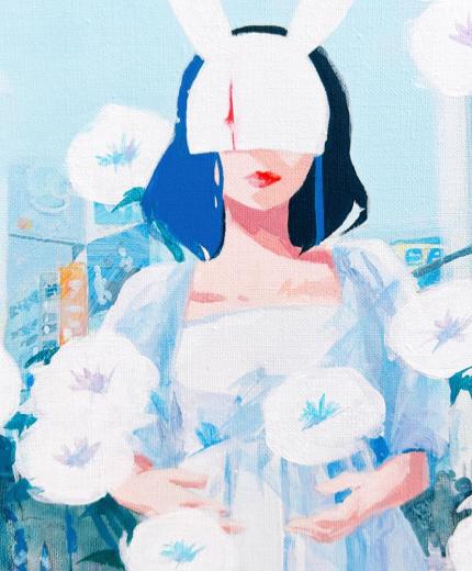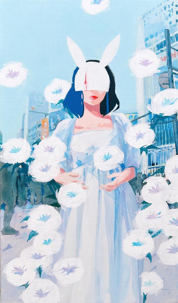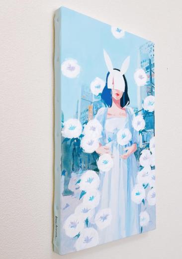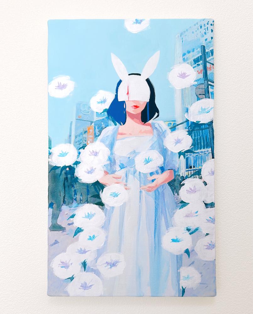 In this body of work, I depicted young women standing in Shibuya, with their surroundings gradually transforming into fields of flowers?not through video, but through a sequence of paintings (two size M60 pieces and six size M6 pieces). Each canvas captures the passage of time in still images, much like the key frames of an animation.