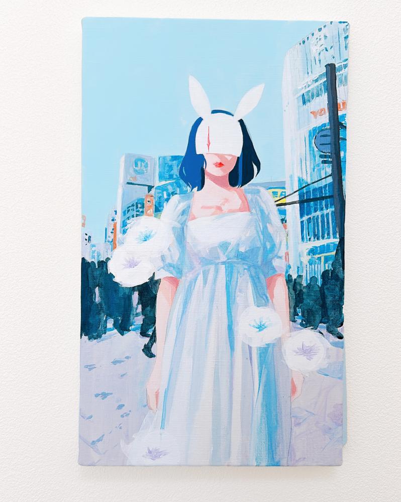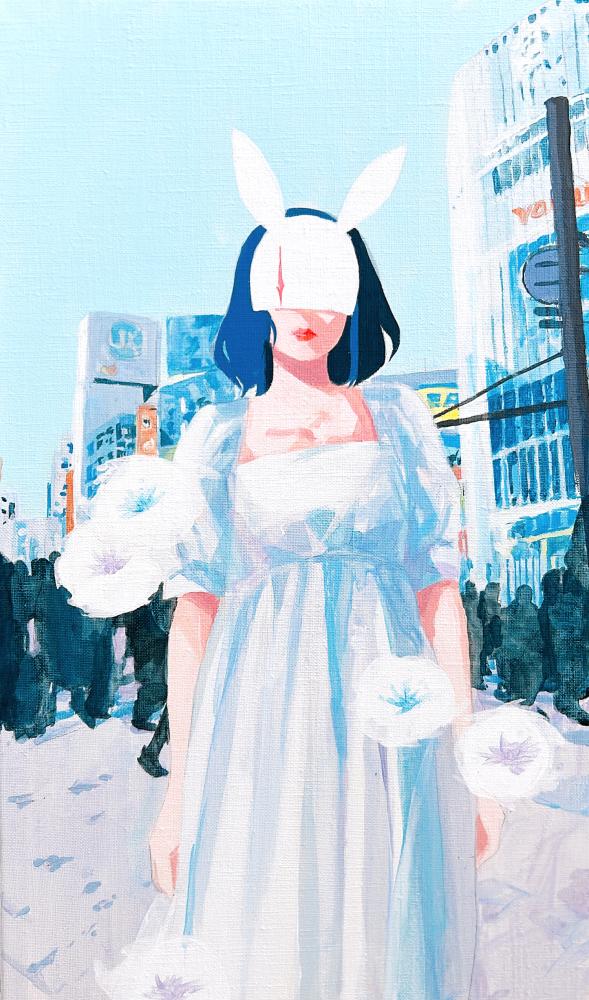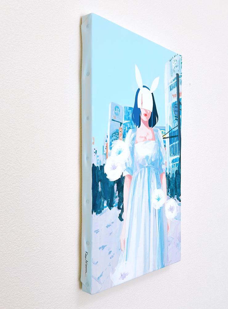 In this body of work, I depicted young women standing in Shibuya, with their surroundings gradually transforming into fields of flowers—not through video, but through a sequence of paintings (two size M60 pieces and six size M6 pieces). Each canvas captures the passage of time in still images, much like the key frames of an animation.
