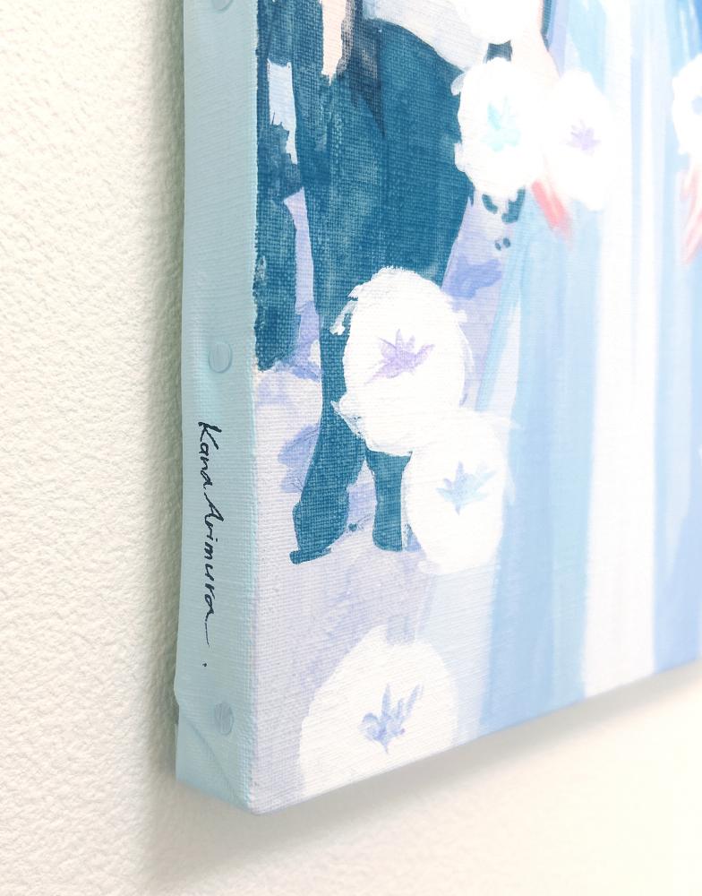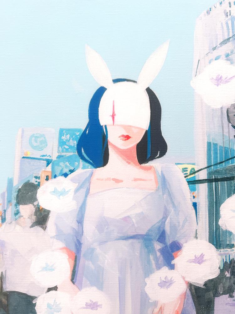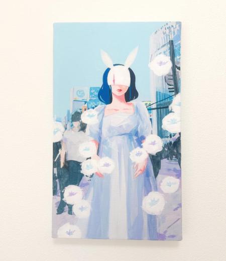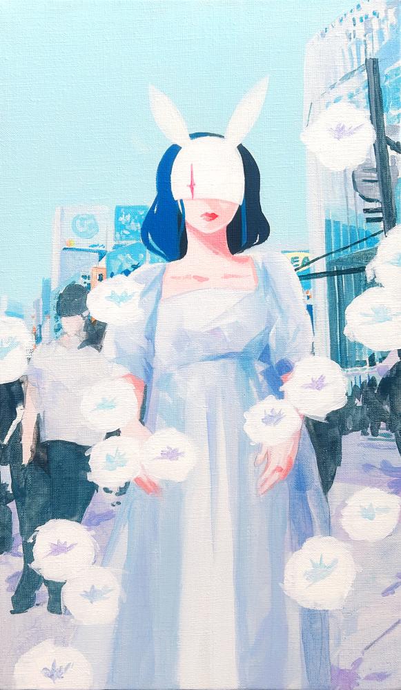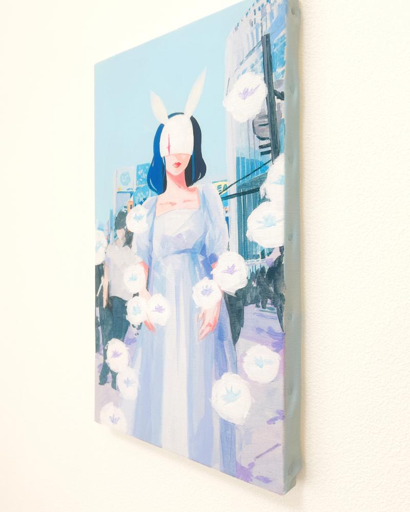 In this body of work, I depicted young women standing in Shibuya, with their surroundings gradually transforming into fields of flowers?not through video, but through a sequence of paintings (two size M60 pieces and six size M6 pieces). Each canvas captures the passage of time in still images, much like the key frames of an animation.