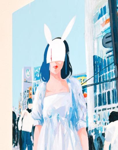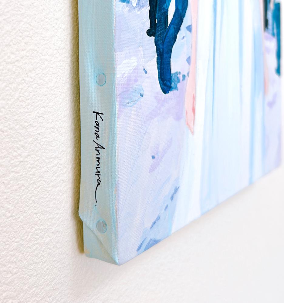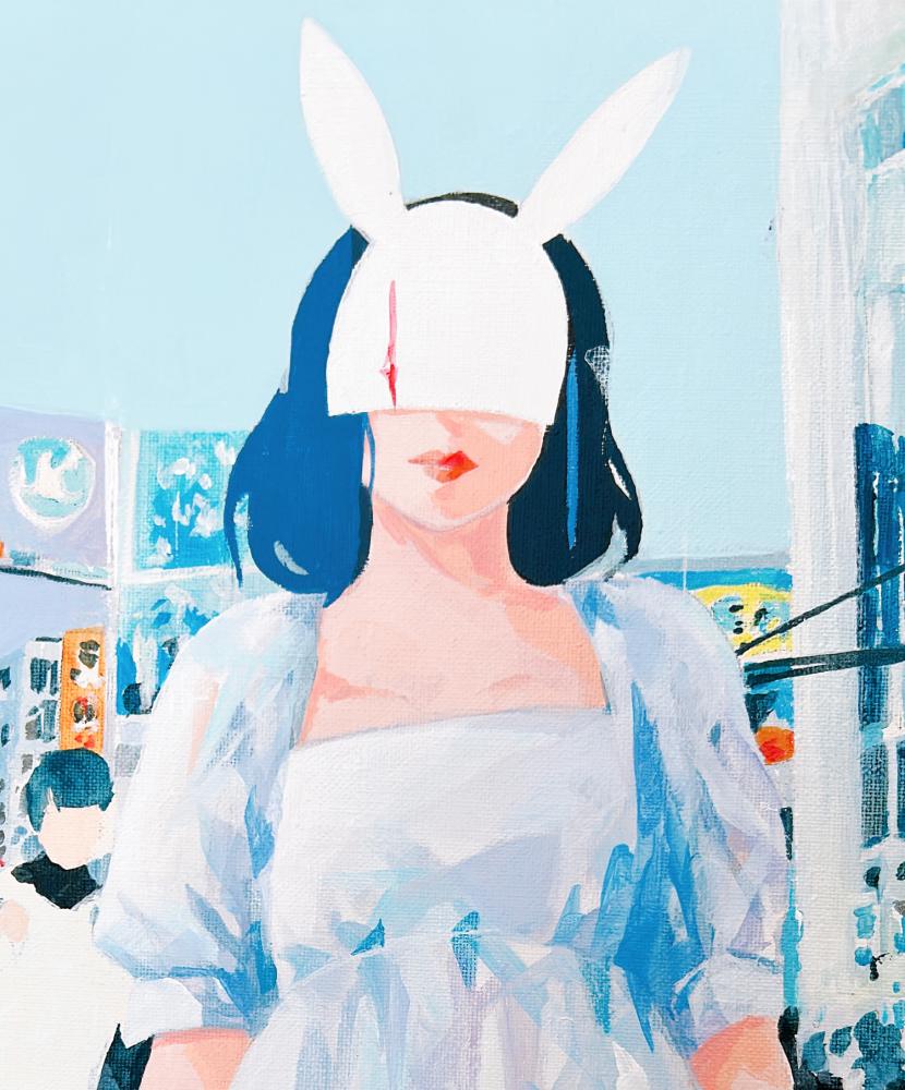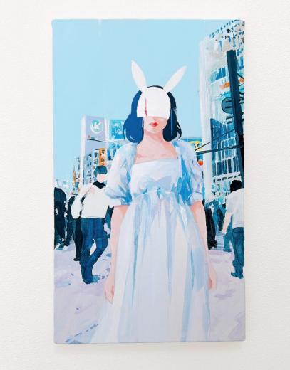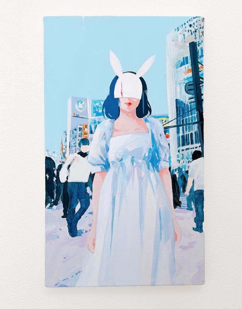 In this body of work, I depicted young women standing in Shibuya, with their surroundings gradually transforming into fields of flowers?not through video, but through a sequence of paintings (two size M60 pieces and six size M6 pieces). Each canvas captures the passage of time in still images, much like the key frames of an animation.